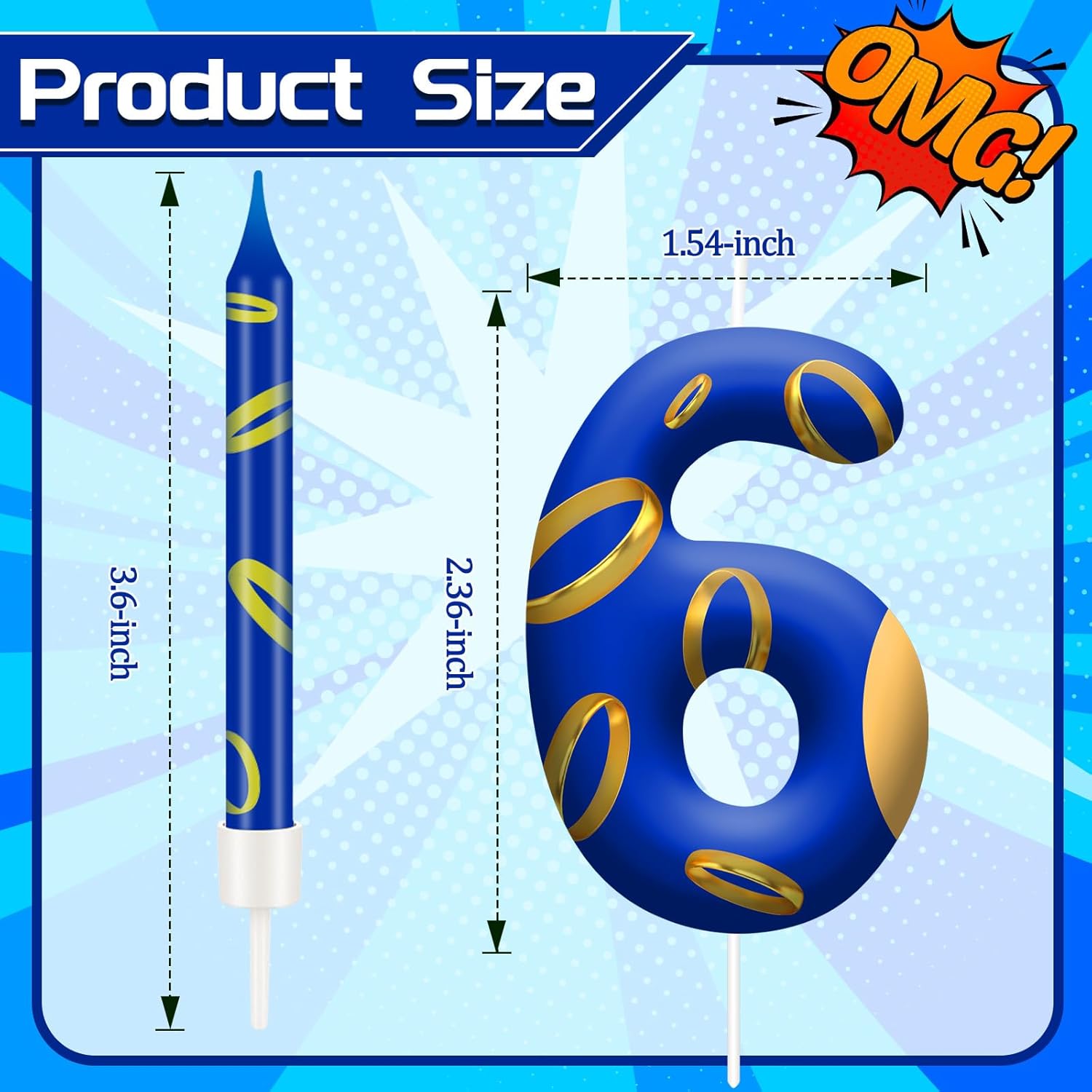 - Packaging: Each candle will be individually wrapped. This fashionable golden ring design pairs perfectly with the blue color, allowing you to easily personalize the candles for boys/girls' parties or theme decorations.