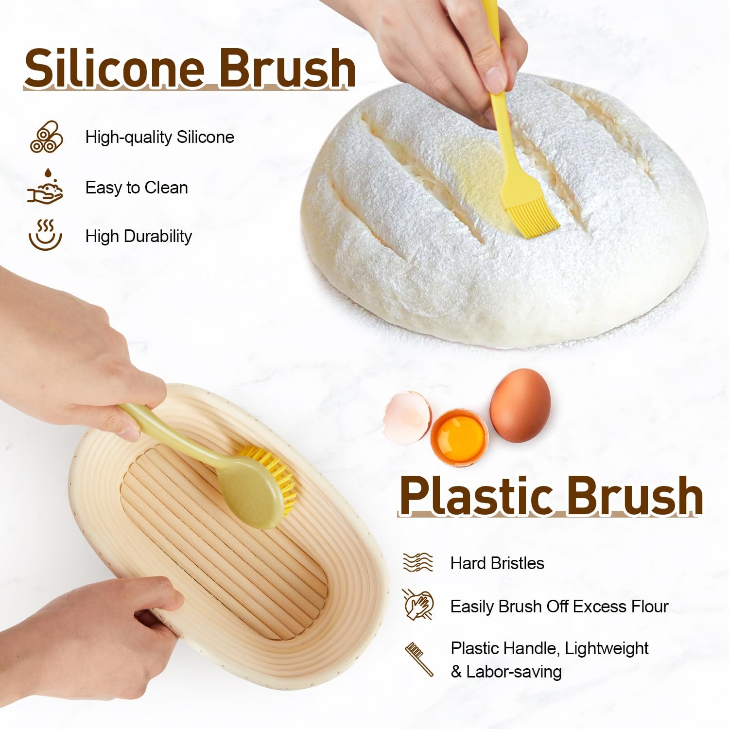 - [What Will You Get] The Sourdough Starter Kit Includes: 1 × 10-Inch Oval Banneton Bread Proofing Basket with Linen Liner, 1 × Dough Whisk, 1 × Bread Lame with 5 Blades, 1 × Dough Scraper, 1 × Bowl Scraper, 1 × Silicone Brush, 1 × Cleaning Brush, 1 × Flour Duster, 16 × Baking Stencils, 1 × User Manual. These sourdough bread baking supplies are designed for both beginners and professionals—everything you need to create delicious artisan loaves with ease.