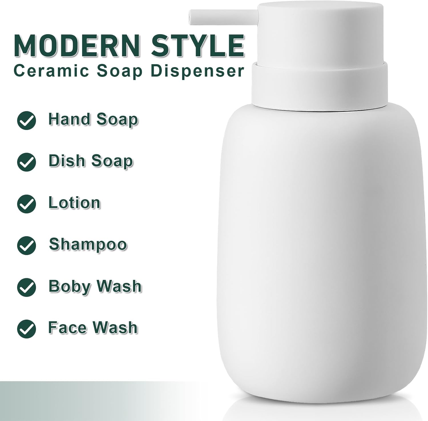Ceramic Hand Soap Dispenser for Bathroom,16OZ Matte Dish Soap Dispenser for Kitchen Sink,Refillable Liquid Lotion Dispenser with Easy-to-Press Pump Rubber Paint (White)