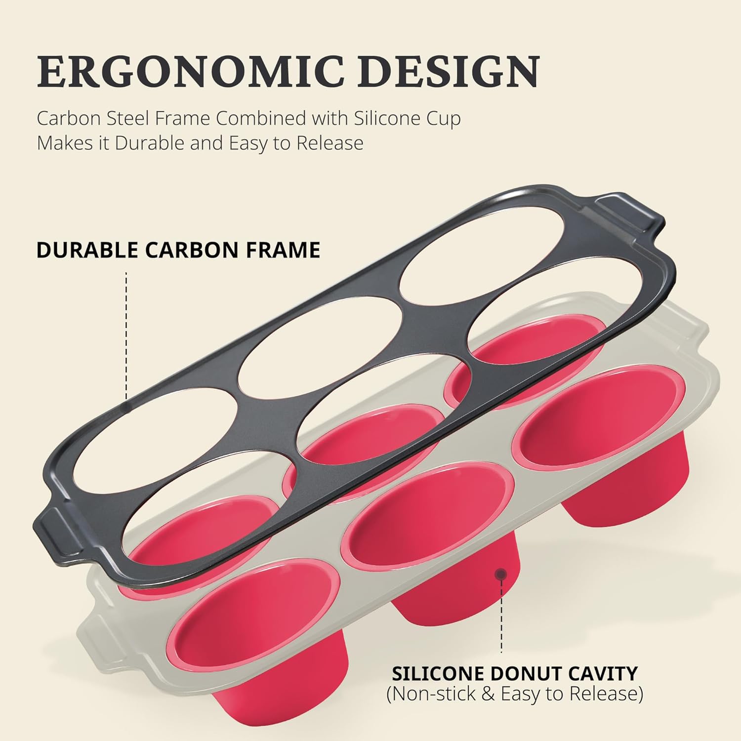 - DURABLE CARBON STEEL FRAME - Our jumbo muffin pan features a robust carbon steel frame, providing superior support and stability. Unlike all-silicone pans, this hybrid design ensures the pan stays strong and maintains its shape, even when handling thick batters. The sturdy carbon steel construction resists warping and bending at high temperatures, offering better control and reliability throughout the baking process.