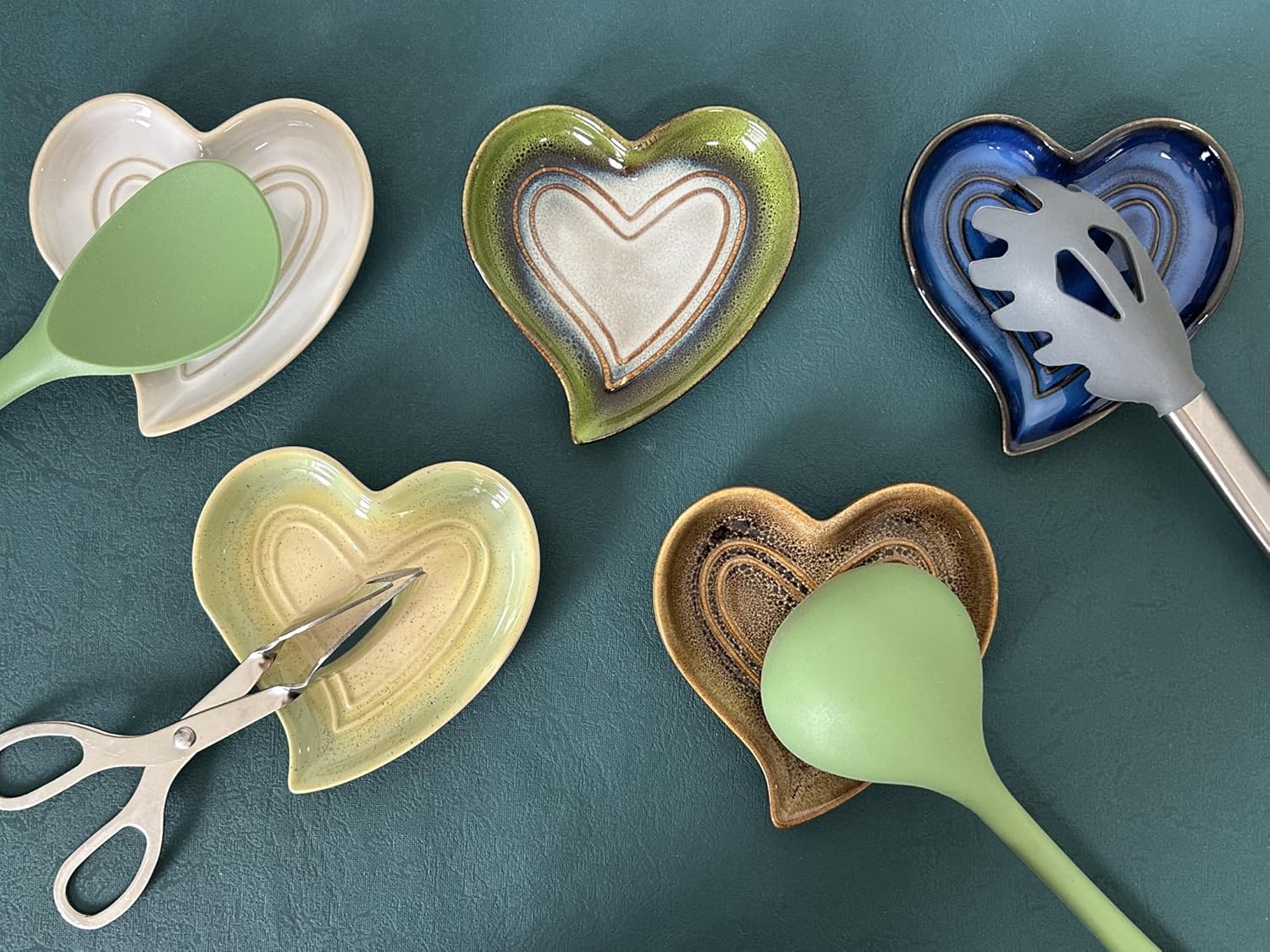 Ceramic Spoon Rest for Stove Top, Heart Cute Spoon Rest for Kitchen Counter, Cooking Spoon Holder for Kitchen Counter, Utensil Rest Spatula Rest Ladle Holder Tong Rest (Retro Grass Green)