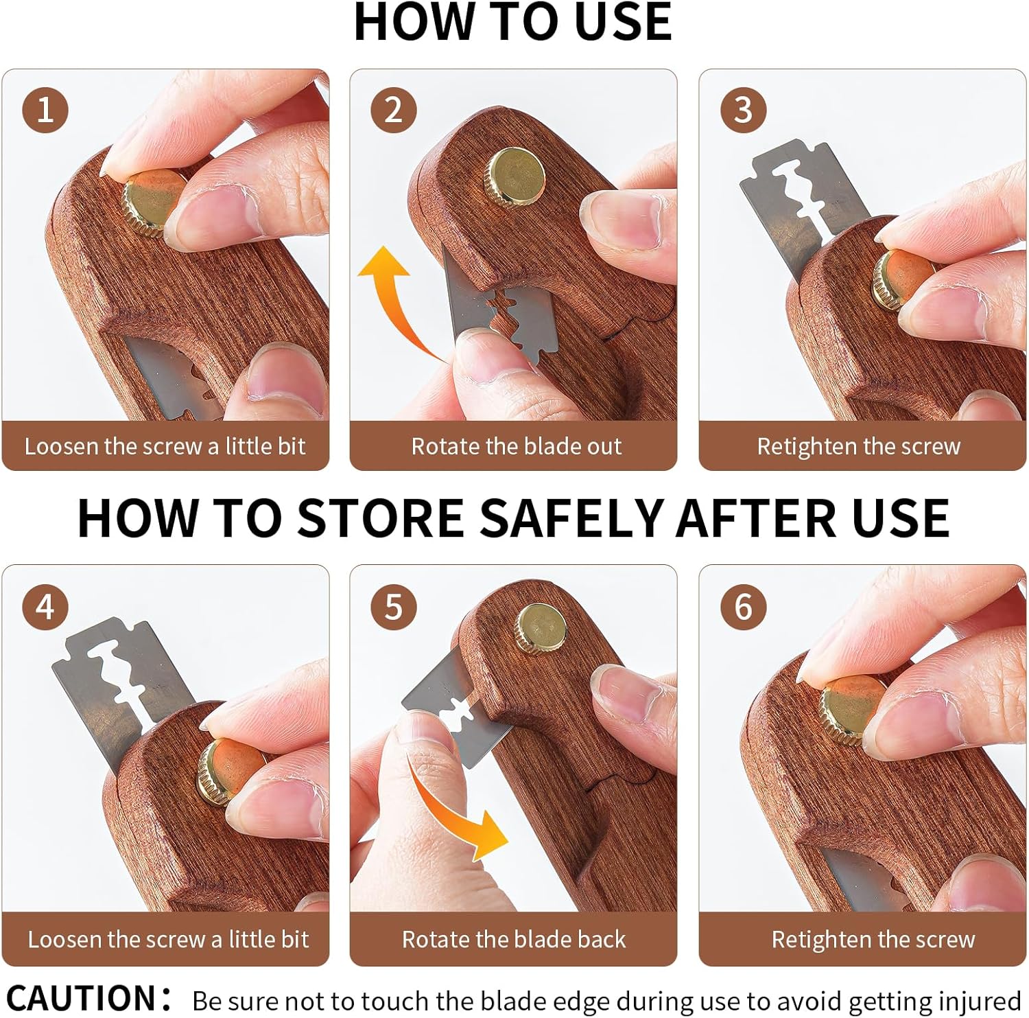 - When using the bread razor tool, you only need to slightly loosen the brass screw a little bit, pull out the blade and then tighten the screw.After use, loosen the screw,rotate the blade downward and pull it back into the wooden handle, and then tighten the screws.When not in use, be sure to rotate the blade back into the handle and tighten the screw,this protects the razor for bread from damage and minimizes accidents in the kitchen.