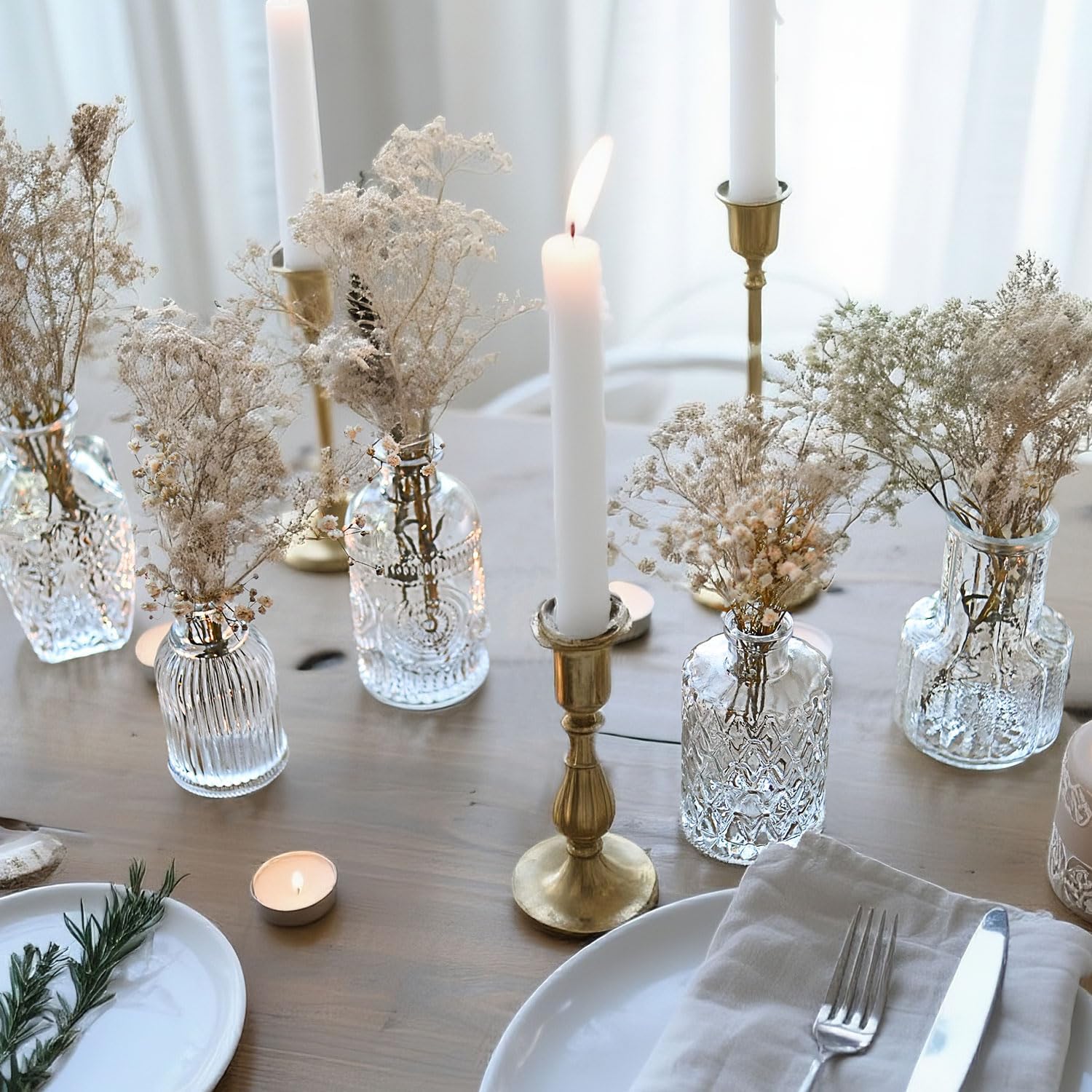 - Versatile Flower Bud Vase Set: This set comprises 12 diverse transparent glass flower bud vases, each adorned with etched designs to further elevate their charm. It is perfectly suited for any home décor. Whether placed as a centerpiece on dining tables, window sills, or wedding banquet tables, these small vintage crystal vases will lend an air of elegance to the setting.