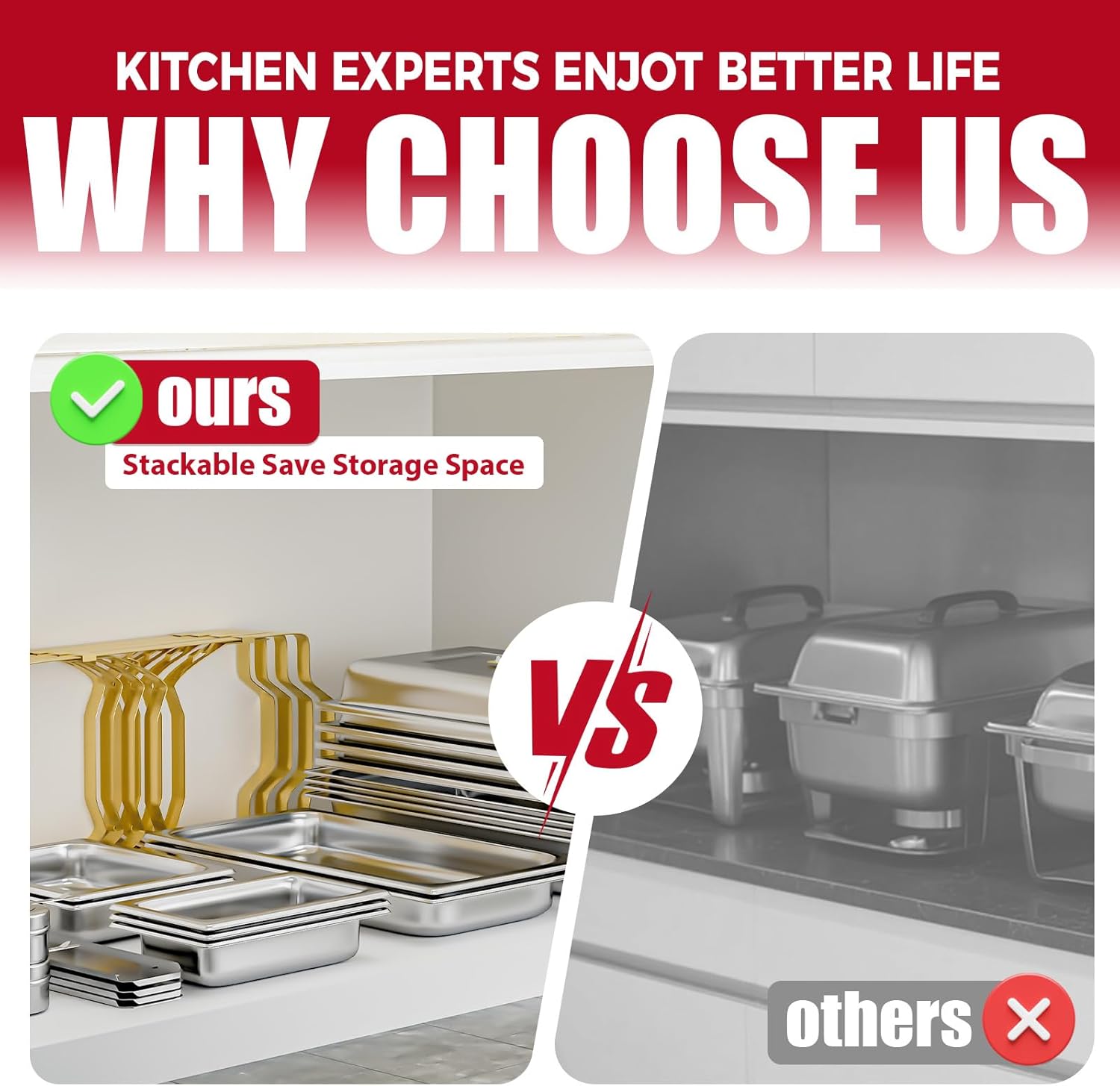 - Functional Design: No matter the heat-insulated handles or sturdy frame, it makes the chafer perform in functionality. All of the food and water pans are stackable which makes the set easy to transport and saves space for storage. Maintain your delicacyโ at the serving temperature for the buffet event with it!