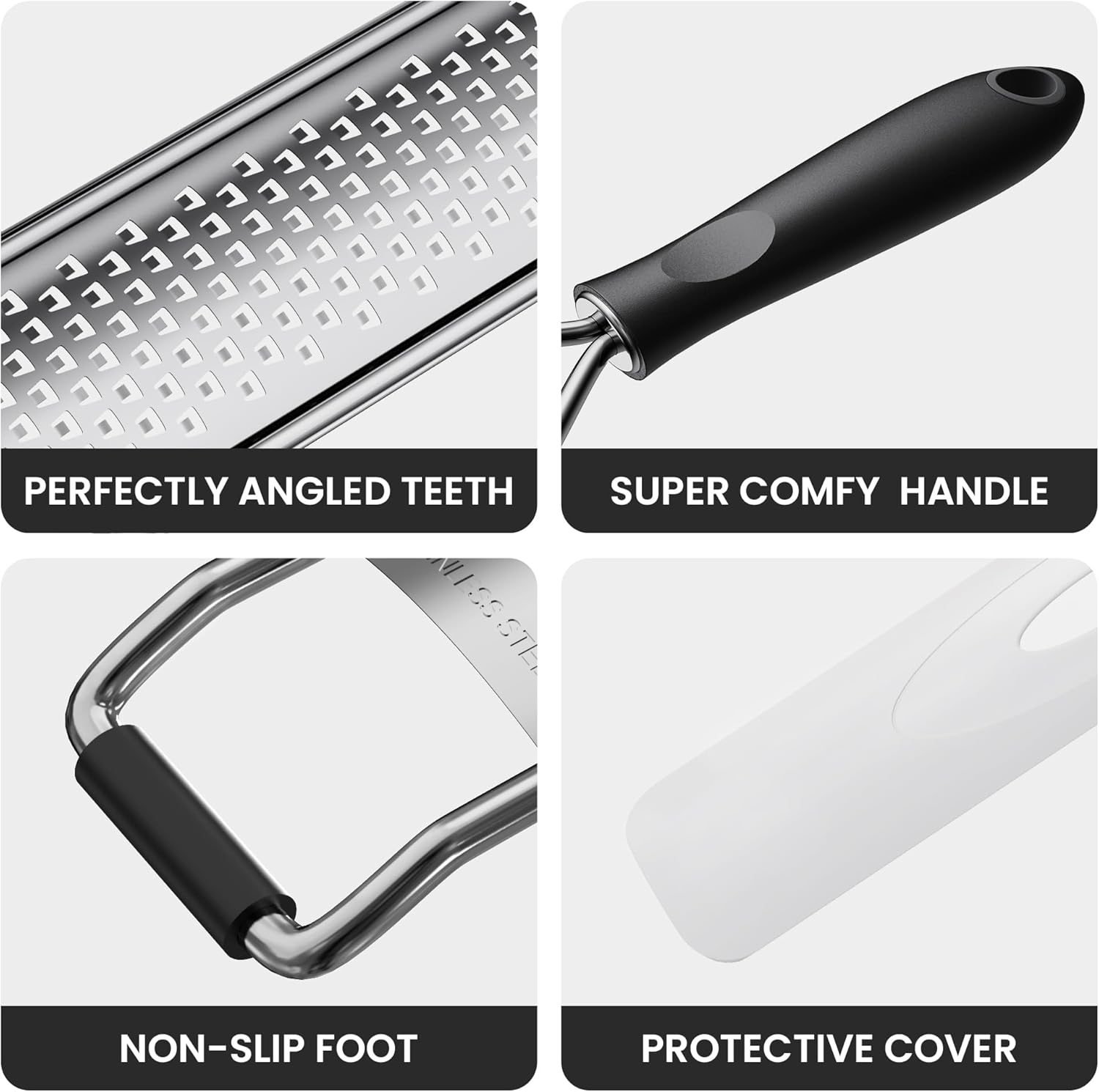 - Cheese grater with non-slip pads on the front to prevent slipping, comes with a protective cover