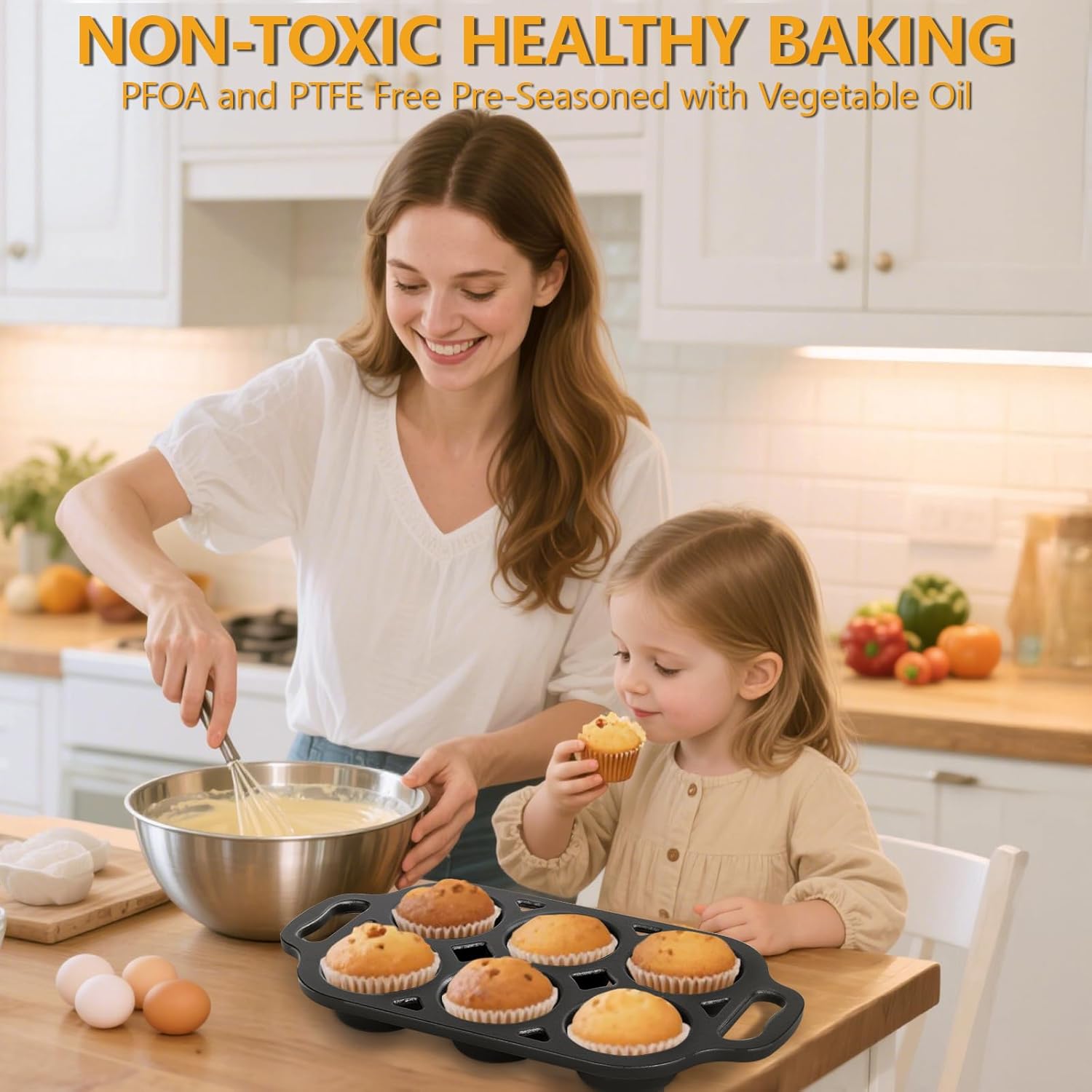 - EASY RELEASE & HEALTHY BAKING: The cast iron cupcake pan is pre-seasoned with vegetable oil to create a naturally non-stick surface. Free from PFOA and PTFE, it ensures easy release and safe, worry-free baking