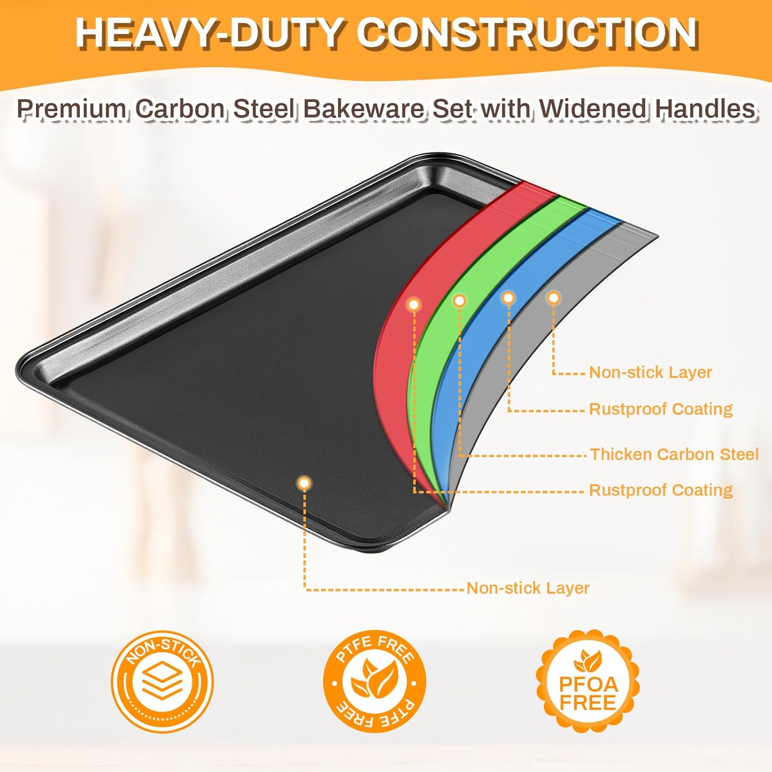 - Premium Materials & Safe Baking: Our baking pans set is crafted from high - quality carbon steel. It's built to last and ensures even heat distribution for perfectly baked treats every time. Boasting a toxic-free nonstick coating free of harmful chemicals like PTFE, PFAS, and PFOA, our oven pan set delivers a healthier baking experience—plus, it ensures cakes, cookies, and breads release effortlessly and clean up with ease