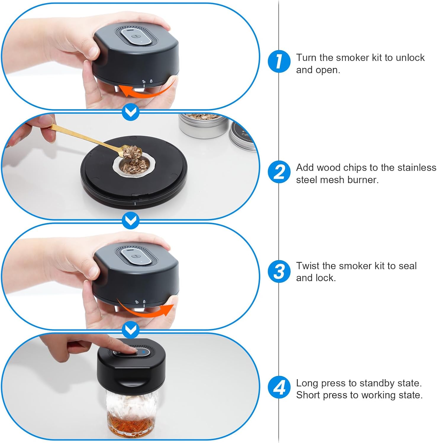 - 【📦 Detailed Package List】Complete with 1*electric smoker, 6*artisanal wood chip flavors, 1*spoon, 1*cleaning brush, dual filtration (1*stainless mesh + 2*oil-absorbing cotton), 1*USB-C cable, 1*manual & travel pouch. This complete cocktail smoker kit arrives gift-boxed - ideal for home mixology starters!