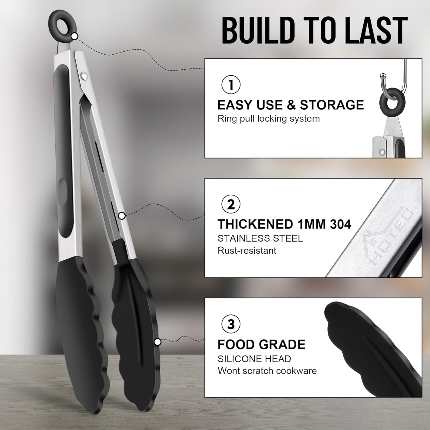 - TOP QUALITY: Hotec silicone tongs are constructed with 1MM Thickened high quality 304 stainless steel and Food Grade slicone, sturdy, heat resistance, anti-rust, anti-corrosion, light weight, easy to handle, like new forever. Package includes: 3 x 9-inch serving tongs (Black)