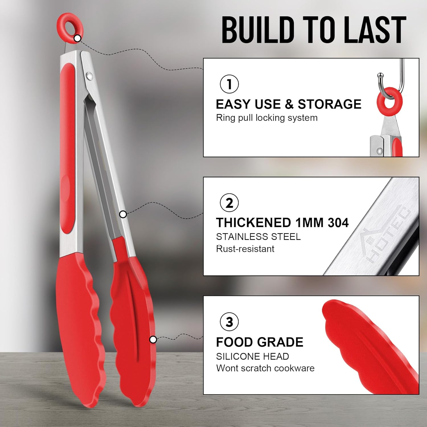- TOP QUALITY: Hotec silicone tongs are constructed with 1MM Thickened high quality 304 stainless steel and Food Grade slicone, sturdy, heat resistance, anti-rust, anti-corrosion, light weight, easy to handle, like new forever. Package includes: 3 x 9-inch serving tongs (Red Blue Green)