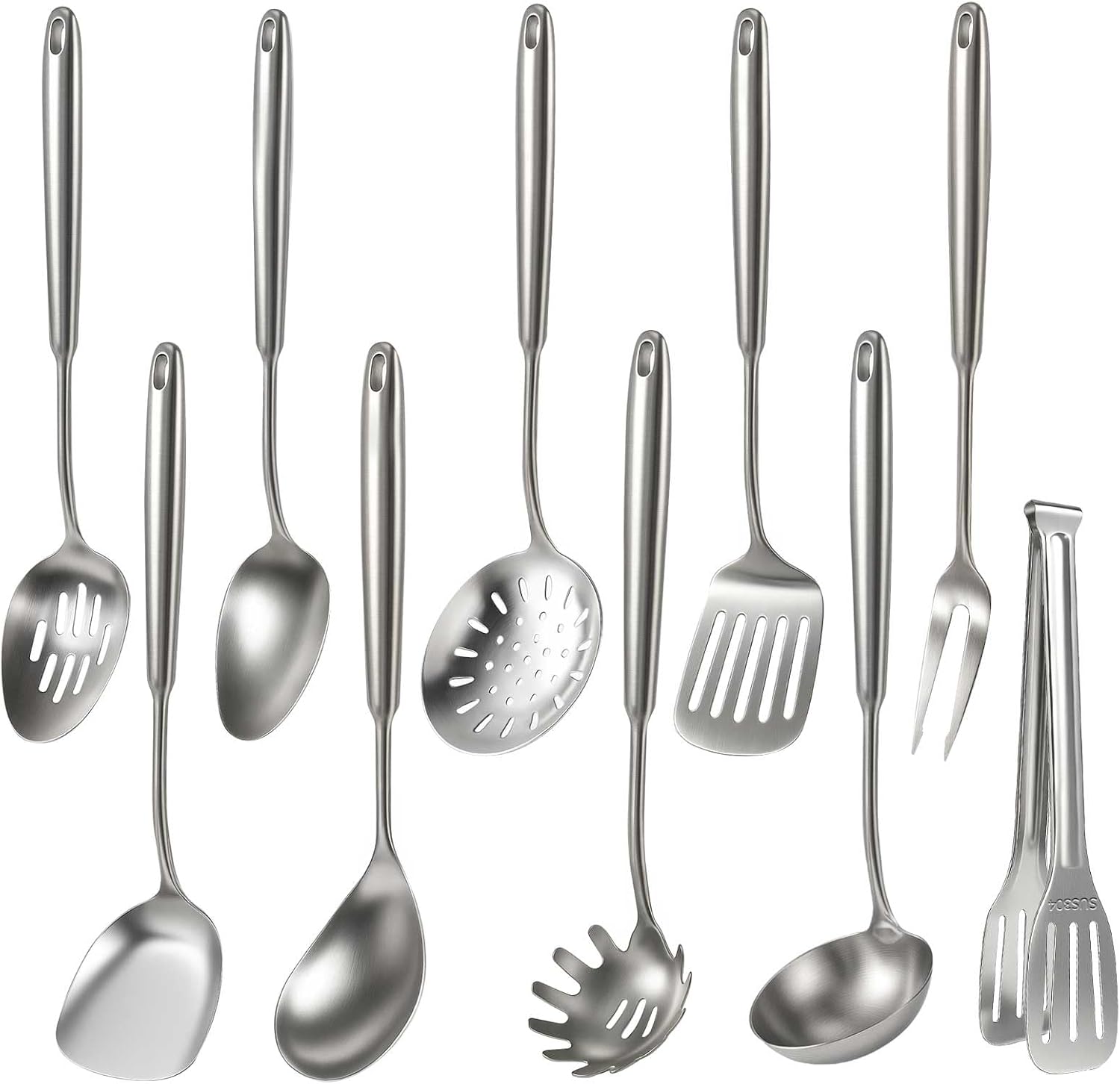Newness 10 Pcs Cooking Utensils Set, 304 Stainless Steel Kitchen Utensils Set, Metal Kitchen Accessories, Include Soup Ladle, Slotted Skimmer Spoon, Spaghetti Spoon and Spatula, Tongs,Dishwasher Safe