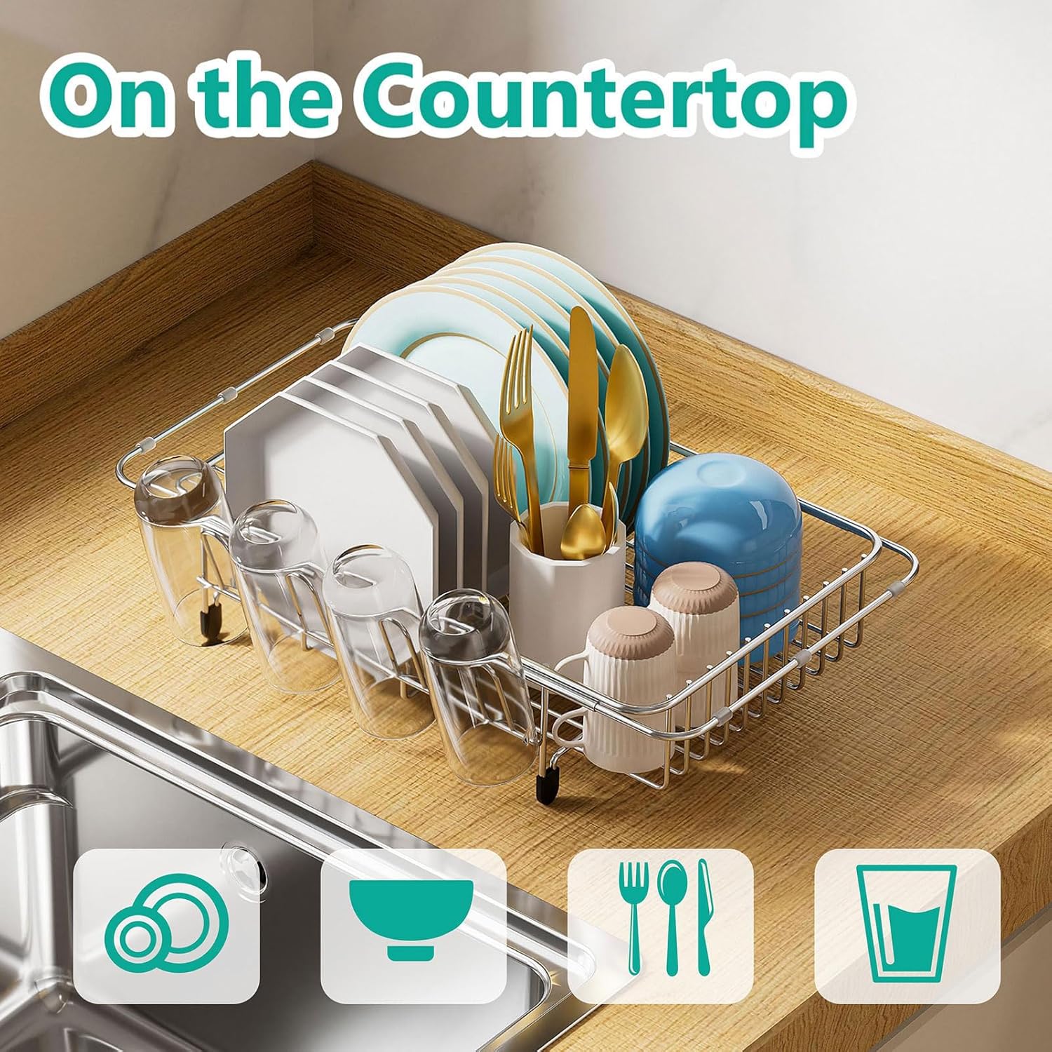 Dish Drying Rack in Sink Expandable Stainless Steel Kitchen Dish Drainer with 4 Cup Holders, Silver