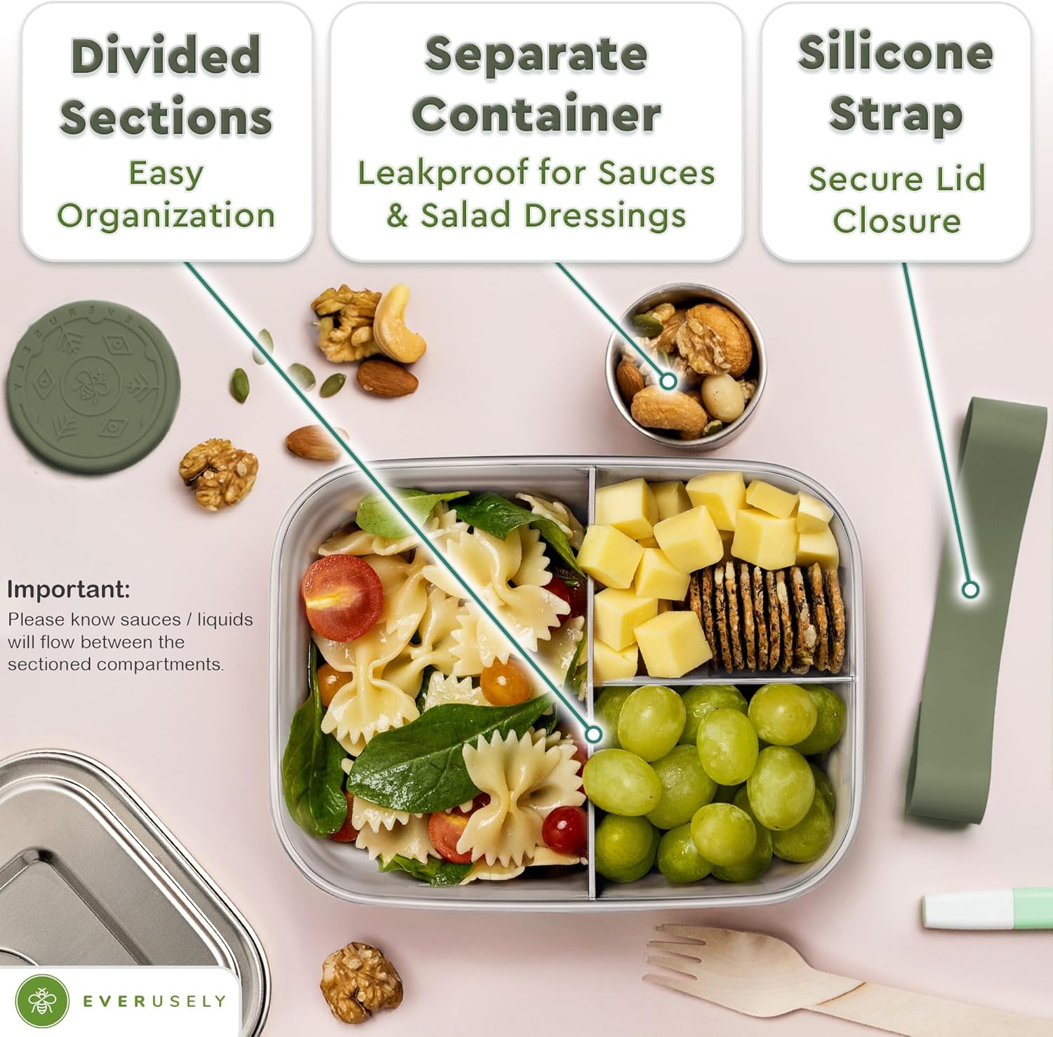 Everusely - Bento Box - Sage, 37oz / 1.1 L - Stainless Steel Lunch Box with Leakproof Condiment Container - 3 Compartment Snack Organizer for On the Go Meals - Freezer & Dishwasher Safe