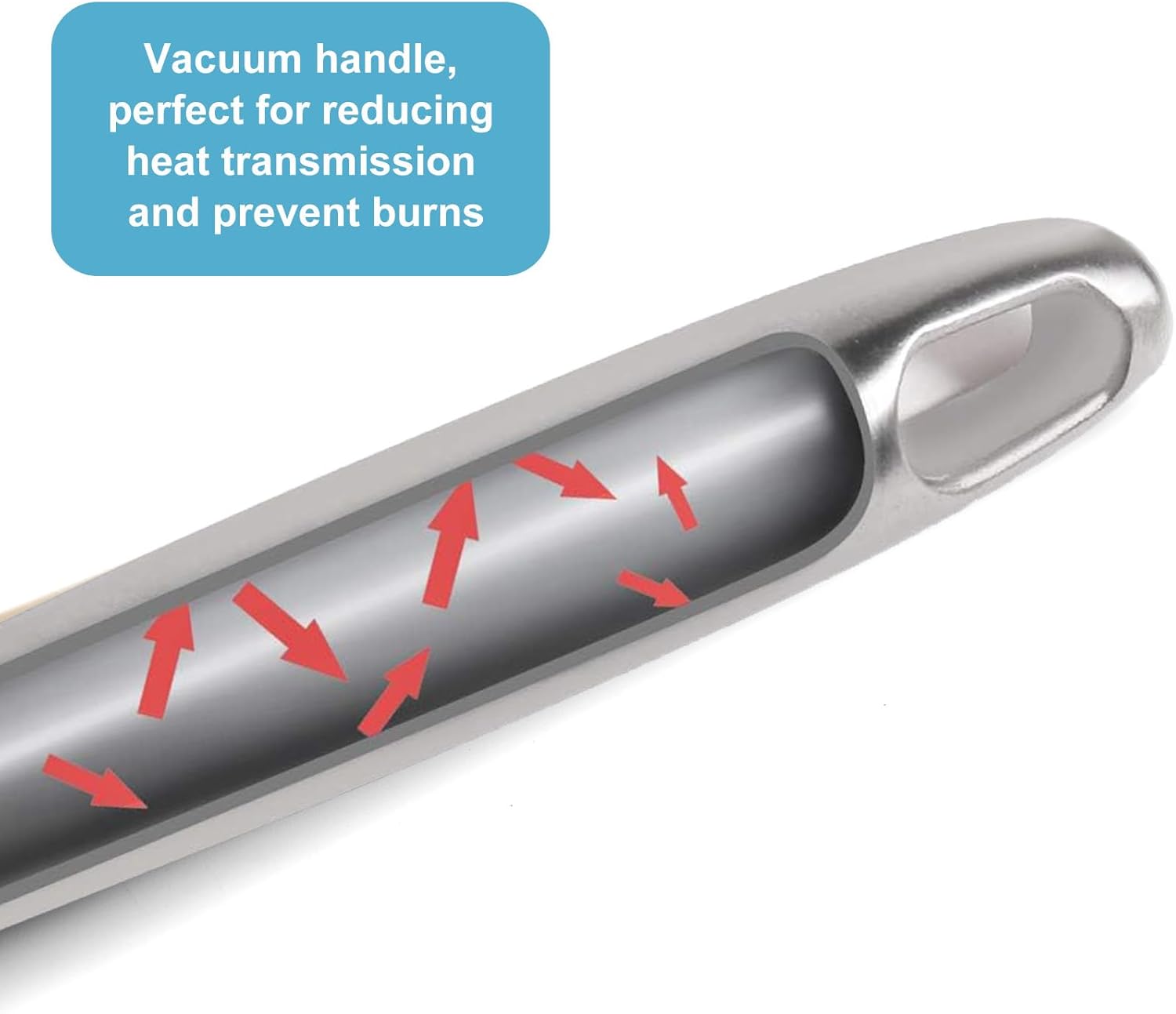- 👐 Ergonomic Heat Resistance Anti-Slip Grip: This stainless steel pasta spoon server set length suitable for most cooking utensils. Vacuum ergonomic round handle for easily holding, reducing heat transfer, not easy to burn your hands.