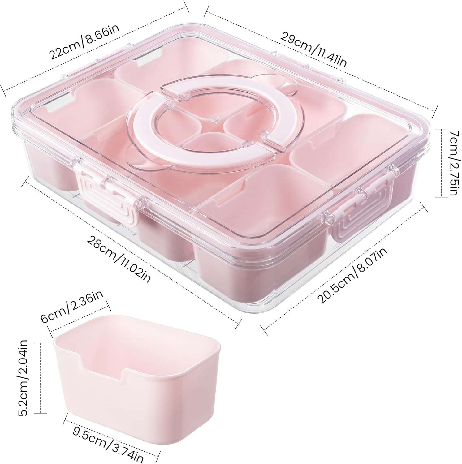 Divided Serving Tray with Lid and Handle - Snackle Box Charcuterie Container for Portable Snack Platters Organizer for Candy, Fruits, Nuts, Snacks - Perfect for Party, Entertaining, Pink