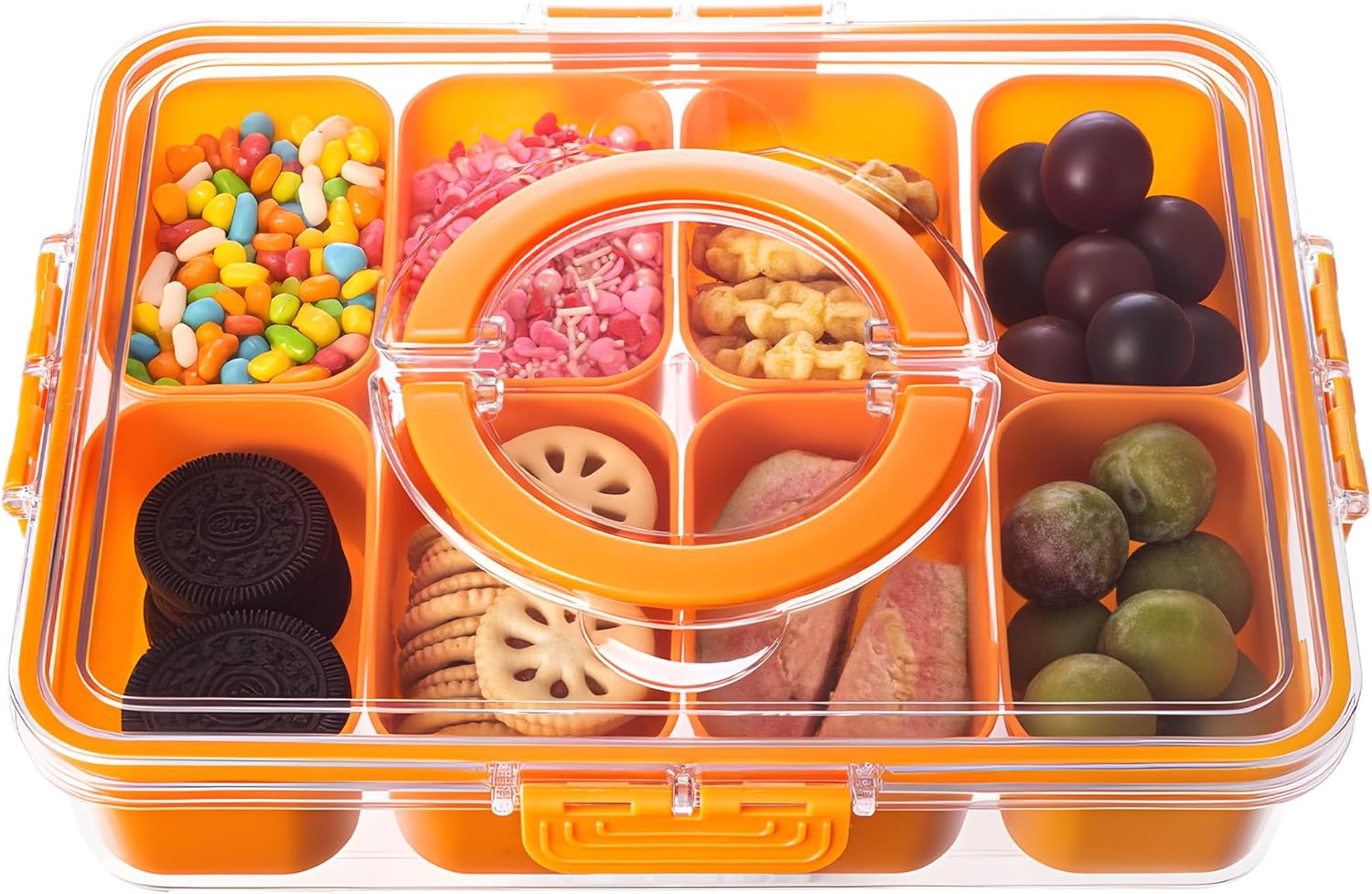 - 8 Removable Compartments οΌThe transparent design of this Container allows you to easily view and access your snacks, keeping them fresh and neatly organized,The clear lid features 4 secure latches and a sealing silicone ring to keep your snacks fresh and prevent spills.