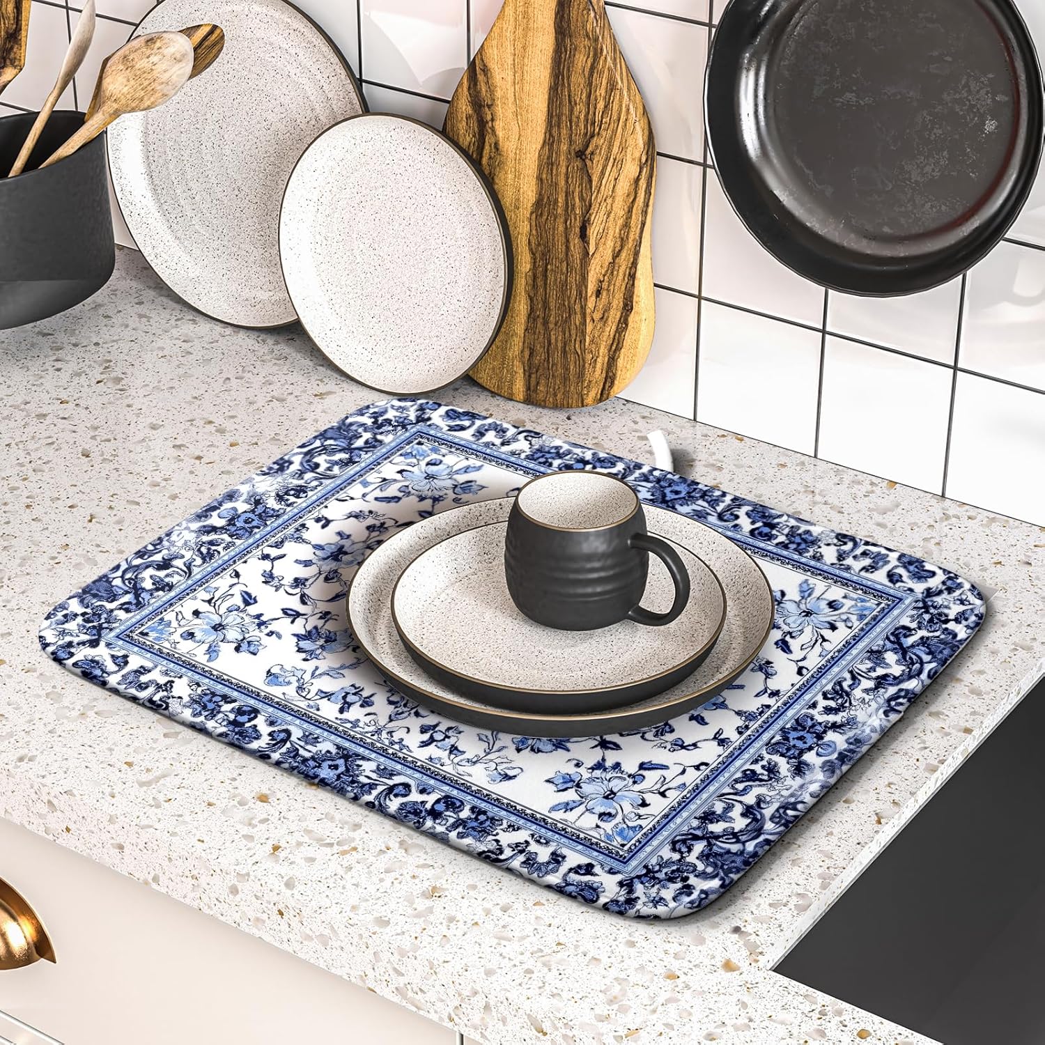 - 【Protect Tableware】Place your dishes on it or under dish racks, the bohemian flower dish mat prevents bowls, glassware, and more tablewares from being scratched or worn, can be used as dish drying mat, sink mat, dishes drainer mats to keep the countertop dry and tidy.