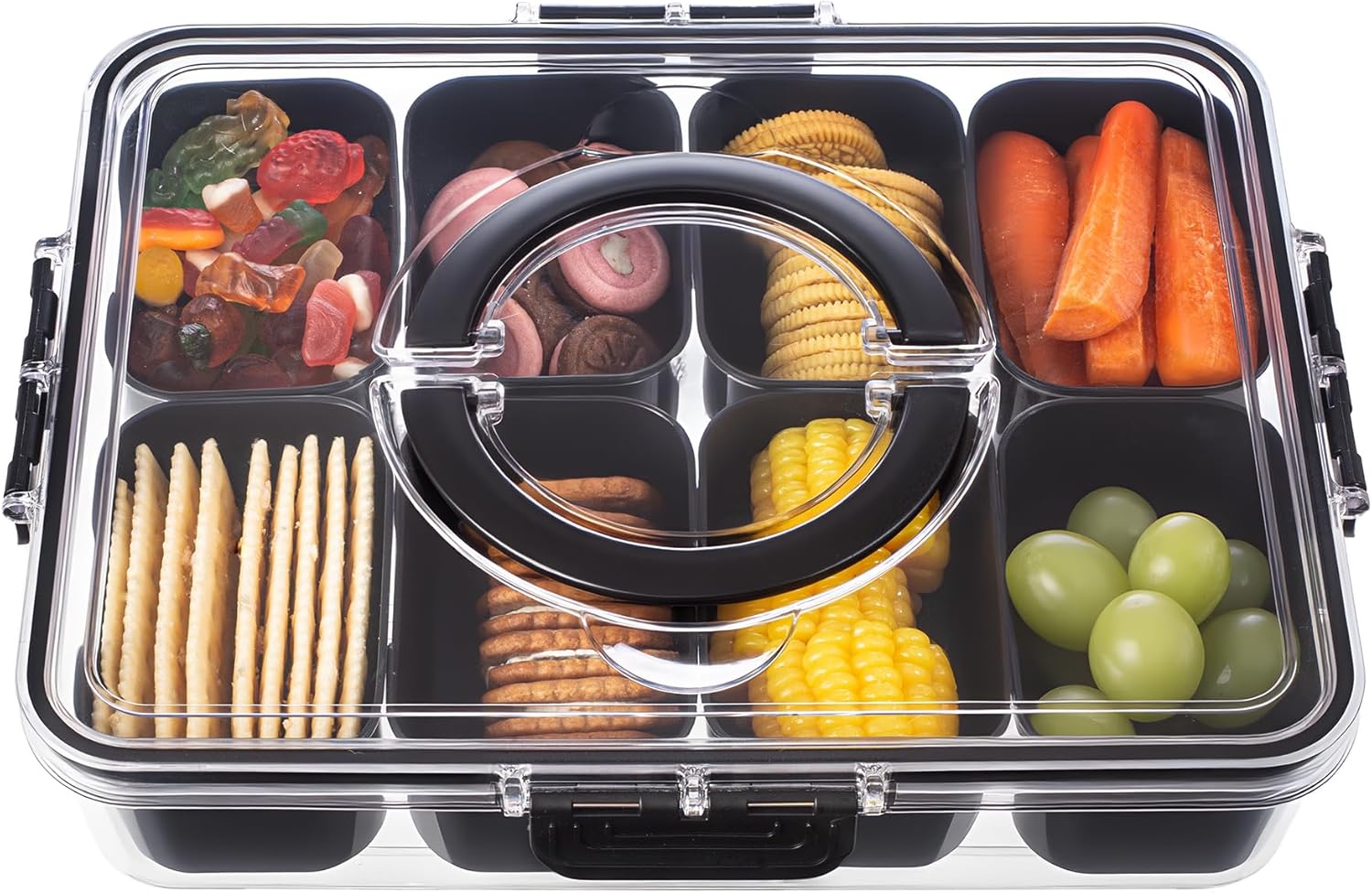 - 8 Removable Compartments οΌThe transparent design of this Container allows you to easily view and access your snacks, keeping them fresh and neatly organized
