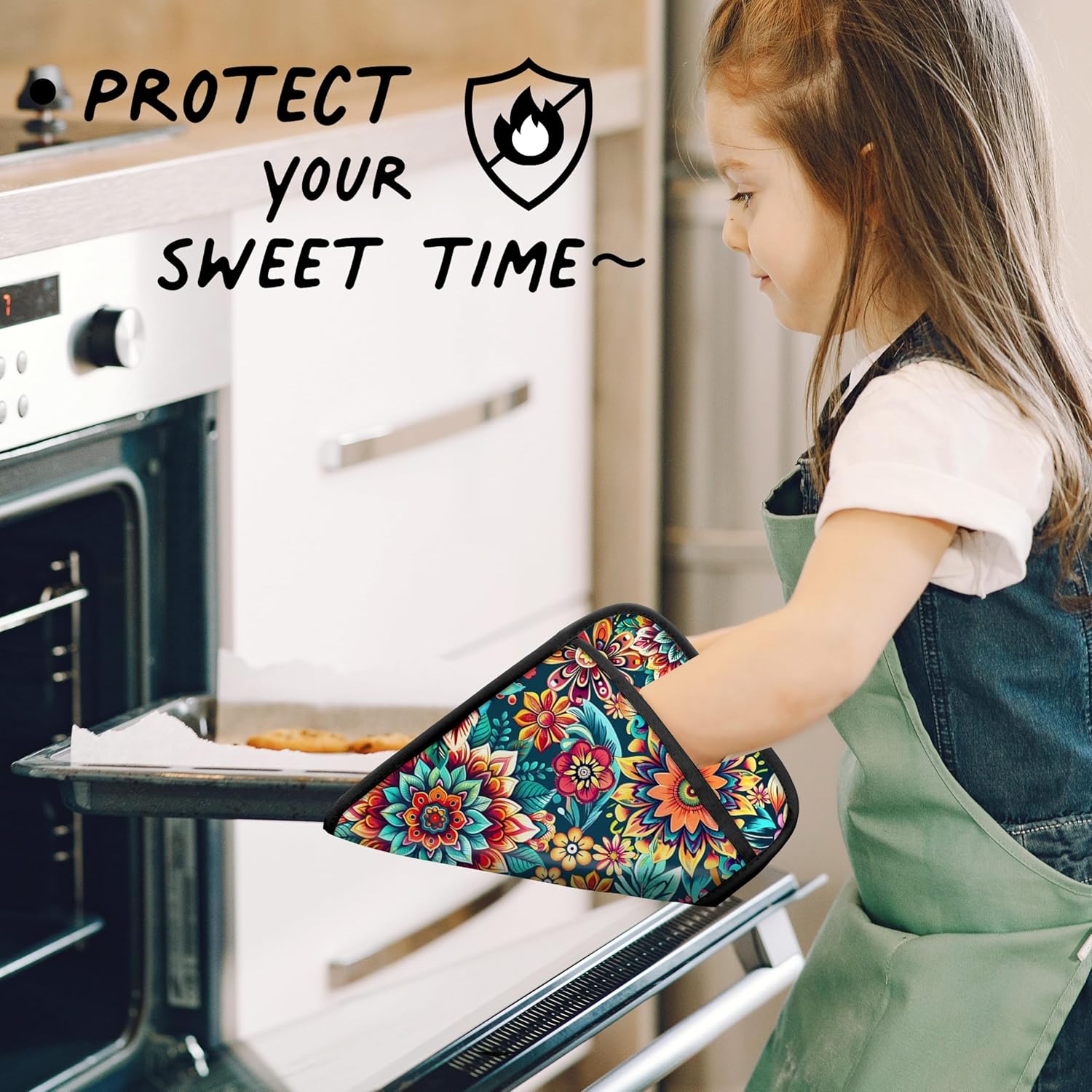 Vibrant Mandala Floral Pot Holders for Kitchen, Boho Abstract Colorful Ethnic Flower Botanical Heat Resistant Hot Pads and Oven Mitts for Baking Cooking