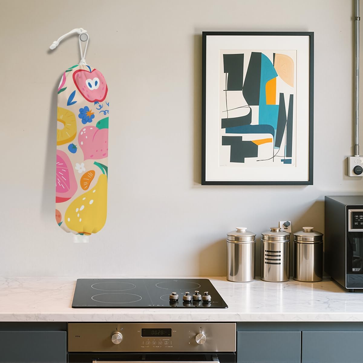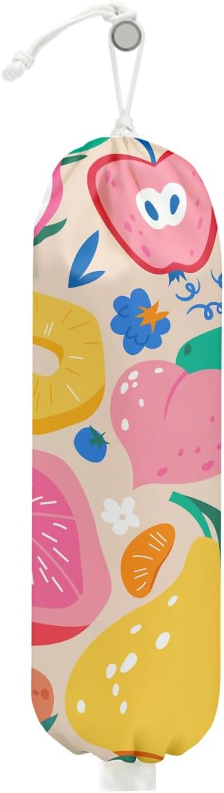 Abstract Summer Fruits Plastic Bag Holder for Kitchen Essentials, Grocery Bag Holder for Plastic Bags, Dragon Fruit Orange Peach Reusable Grocery Bags Storage Dispenser for Home Kitchen Farmhouse