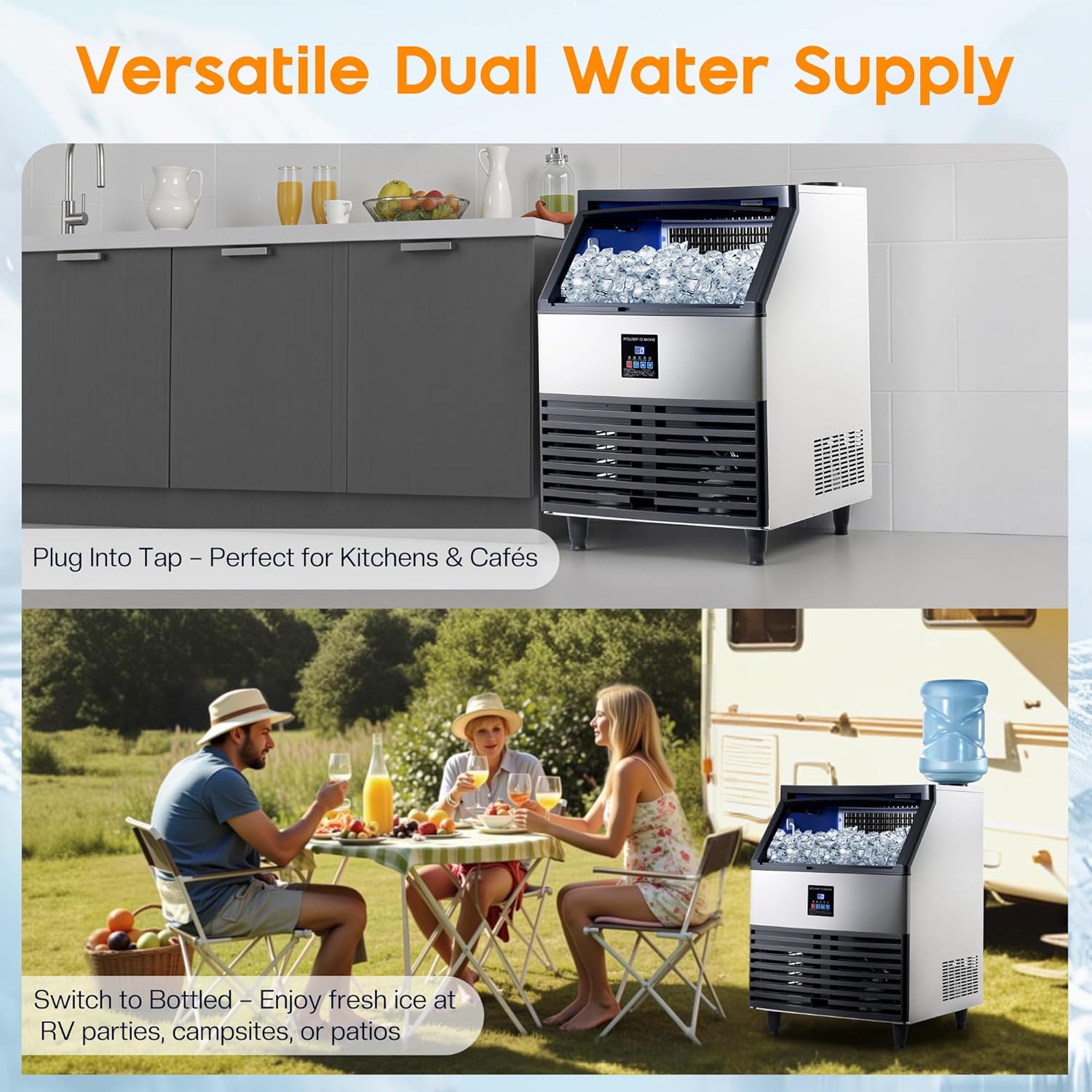 - 【Versatile Dual Water Supply】Supports tap and bottled water for flexible use. Tap water ensures continuous ice-making, while bottled water enables ice production anywhere—ideal for homes, cafes, restaurants, RVs, and outdoor events. Built-in filter ensures cleaner, purer, better-tasting ice
