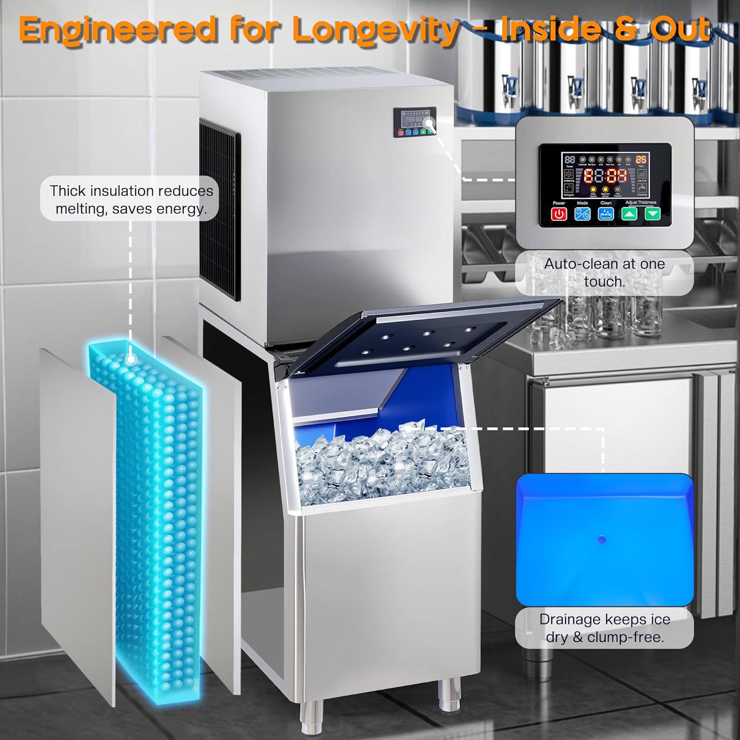 - 【Enhanced Ice Preservation & Easy Maintenance】A drainage guide prevents ice clumping, while cold retention slows melting. The self-cleaning function ensures hygiene and prolongs machine lifespan, making it ideal for home and commercial use