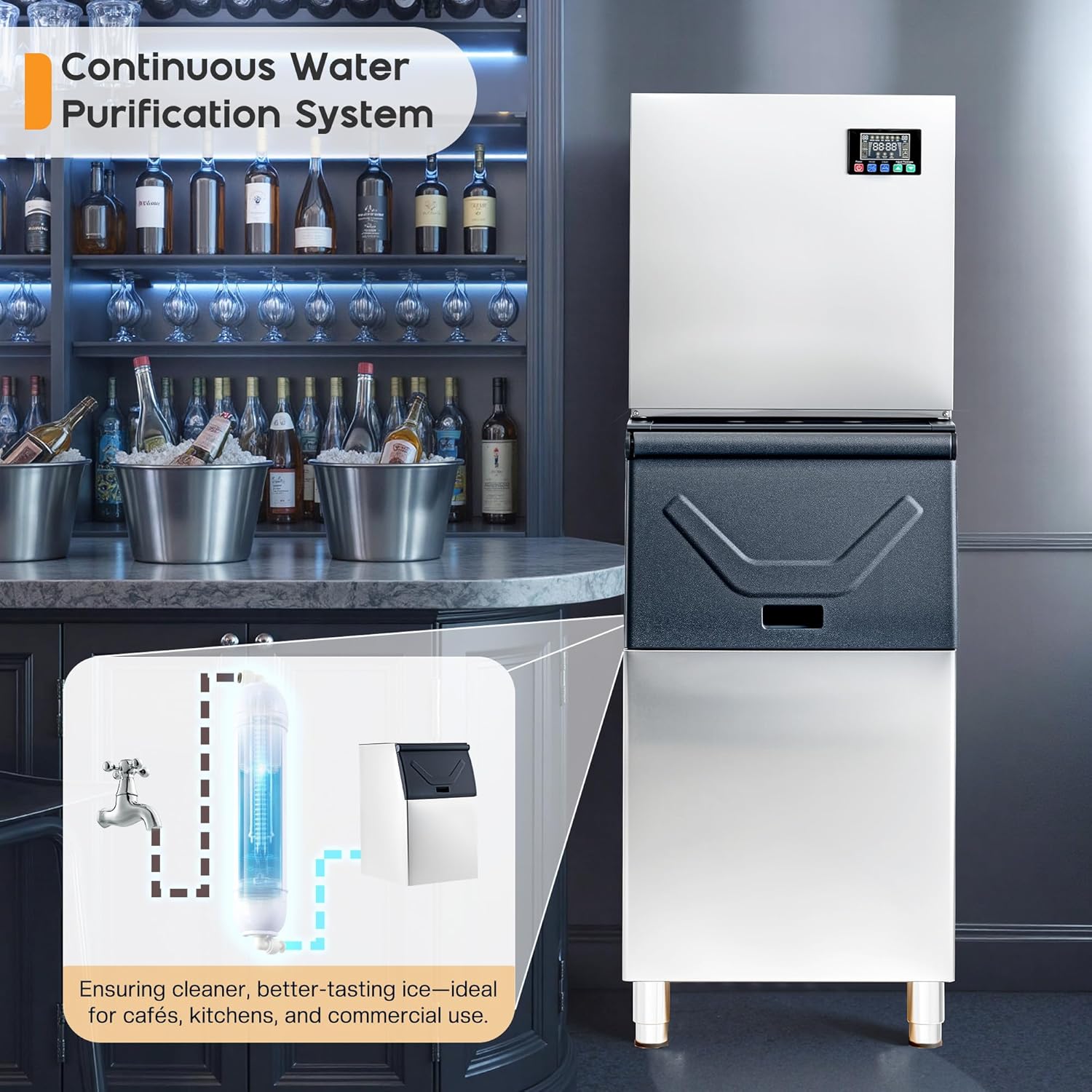 - 【Clean & Continuous Water Supply】Tap water connection with a filter provides continuous water flow and removes impurities, ensuring efficient ice production and cleaner, better-tasting ice for homes, cafés, and restaurants.