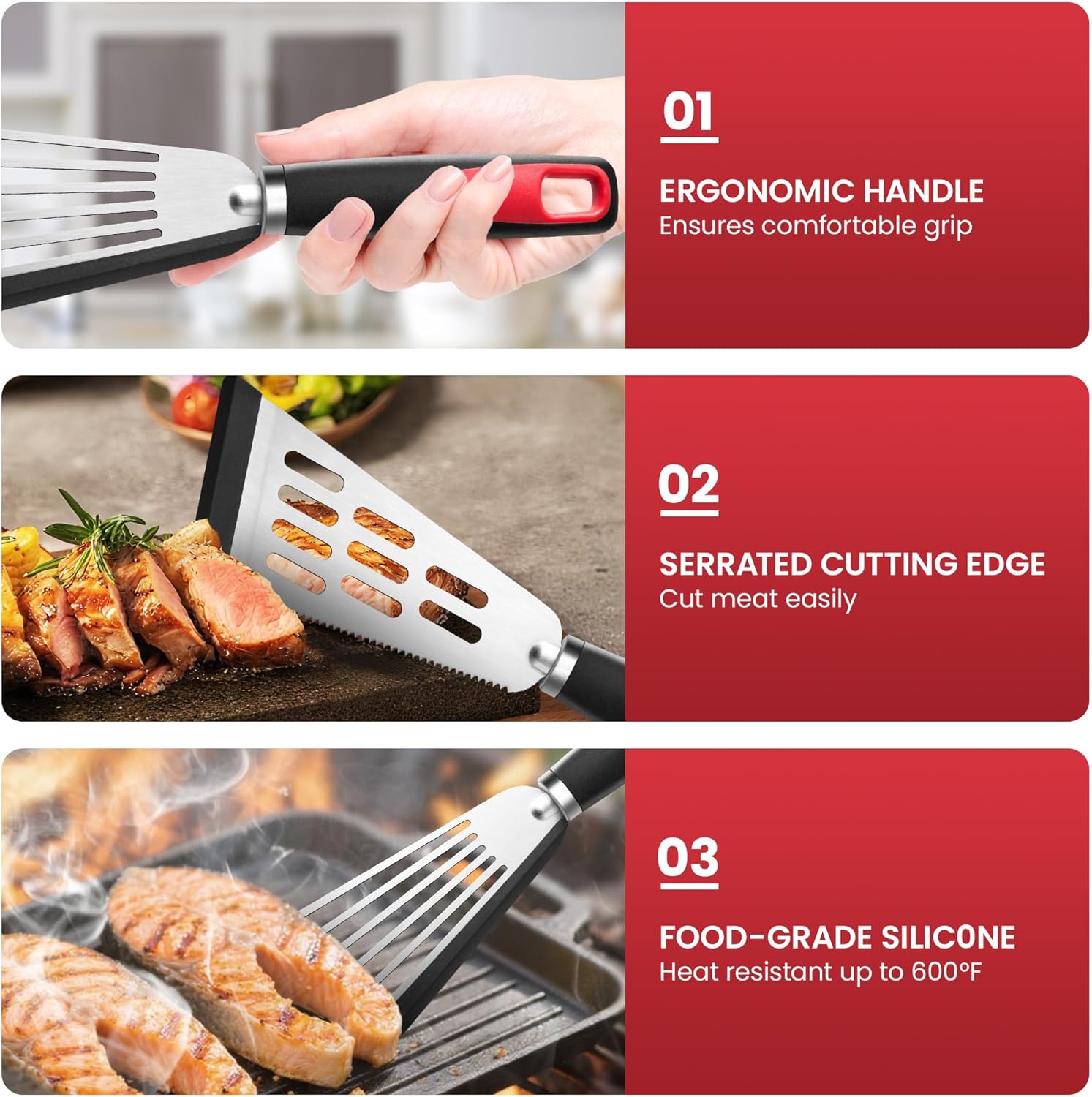 - 【Dual-Design Fish Spatula Set】 One features a broad, thin, and flexible blade, crafted with a gentle curve to hug the pan’s surface. It slides effortlessly beneath delicate fish fillets, pancakes, or burgers for flawless flipping.The other one boasts a serrated edge to tackle cutting tasks, adapting to multiple kitchen scenarios.Perfect for indoor kitchens, outdoor grilling, or camping trips, this essential set empowers home chefs to master everything from pan-seared dishes to BBQ feasts with professional finesse