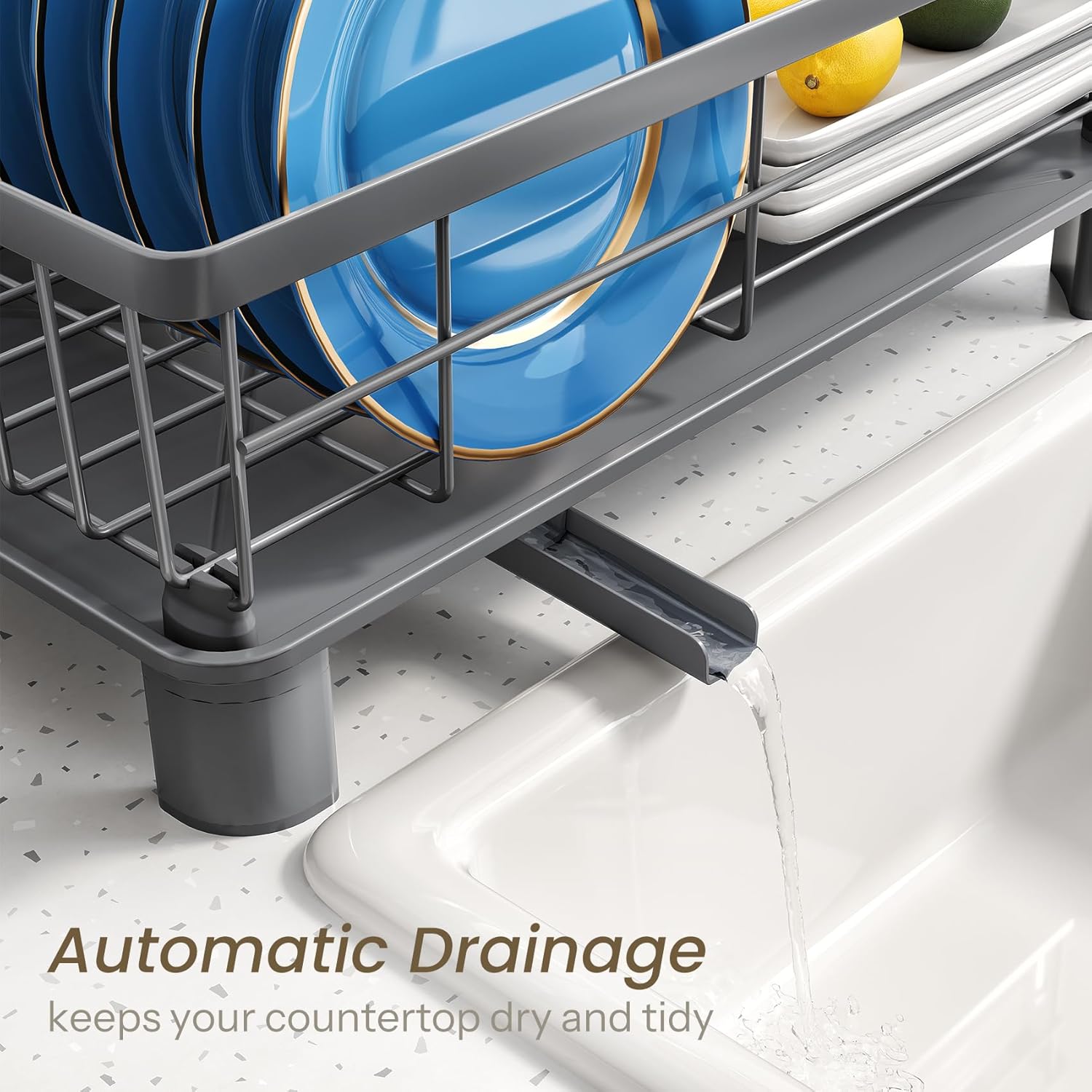 - No More Wet Mess: This dish drainer features an angled drainboard and a water spout that directly channels excess water into the sink. Say goodbye to soggy counters and extra cleanup