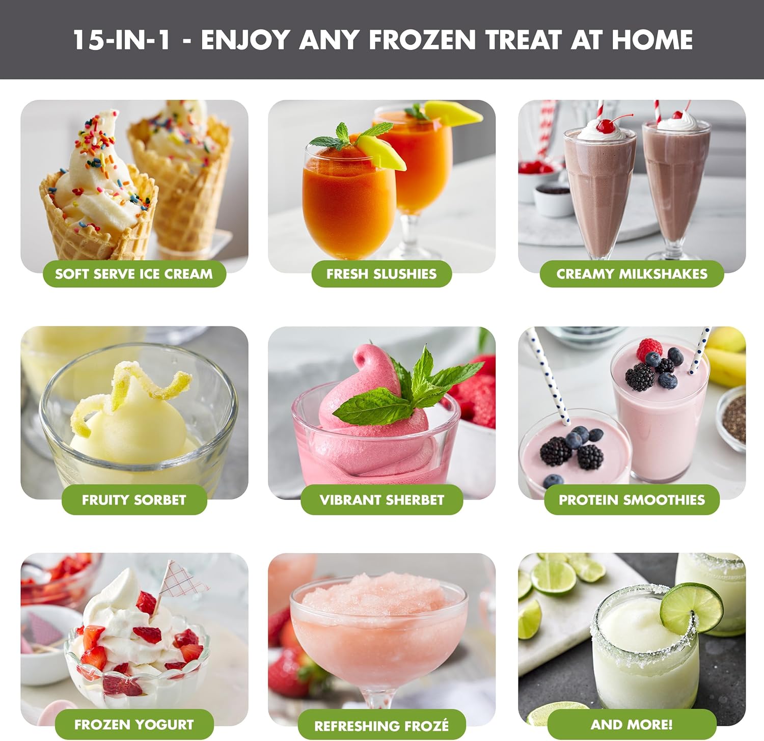 - MAKE IT ALL – 15-IN-1 DESIGN: Frost lets you create everything from classic soft serve ice cream and refreshing slushies, frozé, milkshakes, smoothies, protein shakes, frozen yogurt, dairy-free/vegan ice cream, custard, sorbet, sherbet, frozen cocktails, mocktails, and more for endless possibilities at your fingertips.