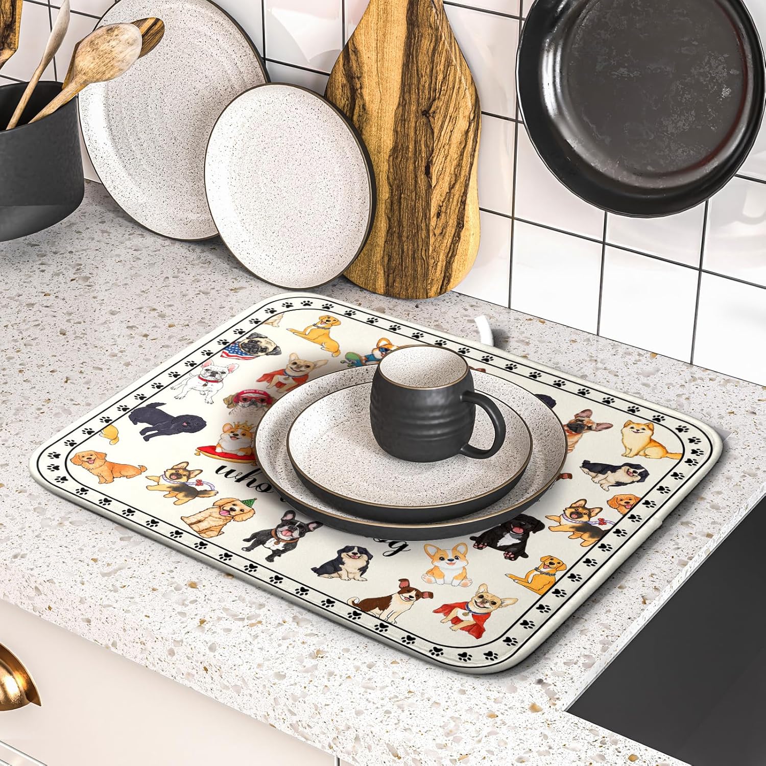 Lovely Dogs Dish Drying Mat Absorbent Printed Drying Pad for Kitchen Counter