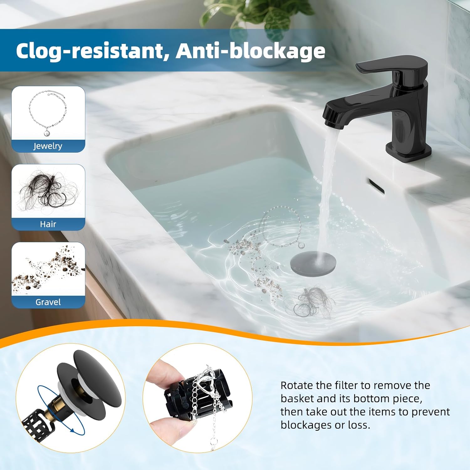 Hibbent Upgraded 3 in 1 Bathroom Sink Drain Strainer, Pop Up Sink Stopper with Big Push Cap, Anti-Clogging Metal Filter Basket,Sink Plug with Hair Catcher for 1.1''~2.36'' Basin, Matte Black
