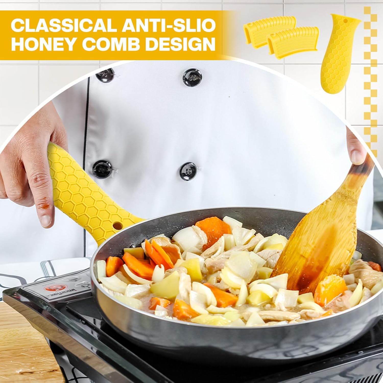 - Package content: there are 4 pieces of silicone hot handle holders that come in yellow, 4 pieces of silicone assist handle holders available in yellow, enough quantity and classic style enough for your daily use, can be changed and shared, and easy to find; Suitable for using at home, travel or camping, nice gift for Mother's day, birthday, holidays, housewarming, chef and hostess