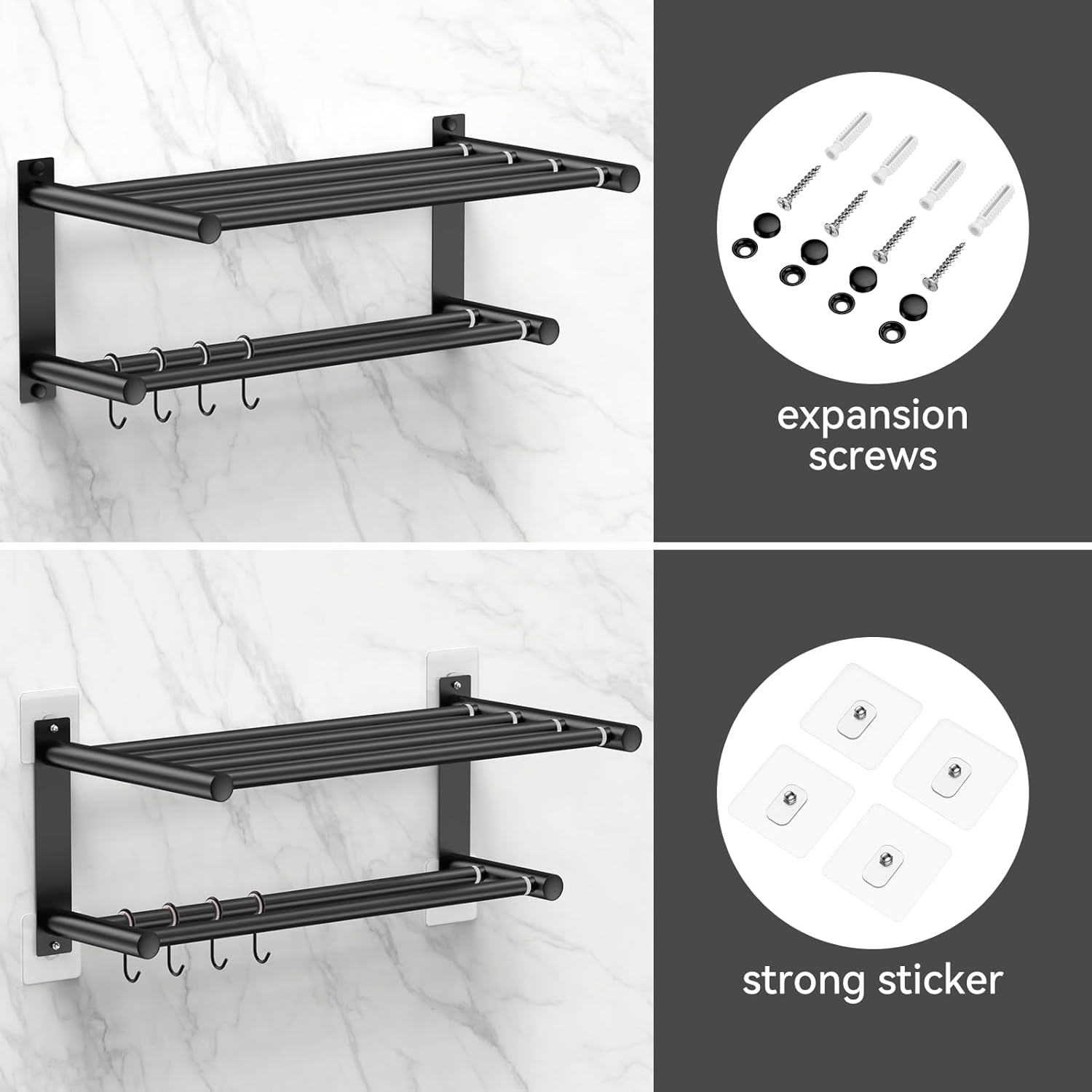 - 【 Easy installation 】: Without drilling holes, the towel rack can be installed using our matching adhesive to protect the wall; The towel rack can also be drilled and installed with screws.