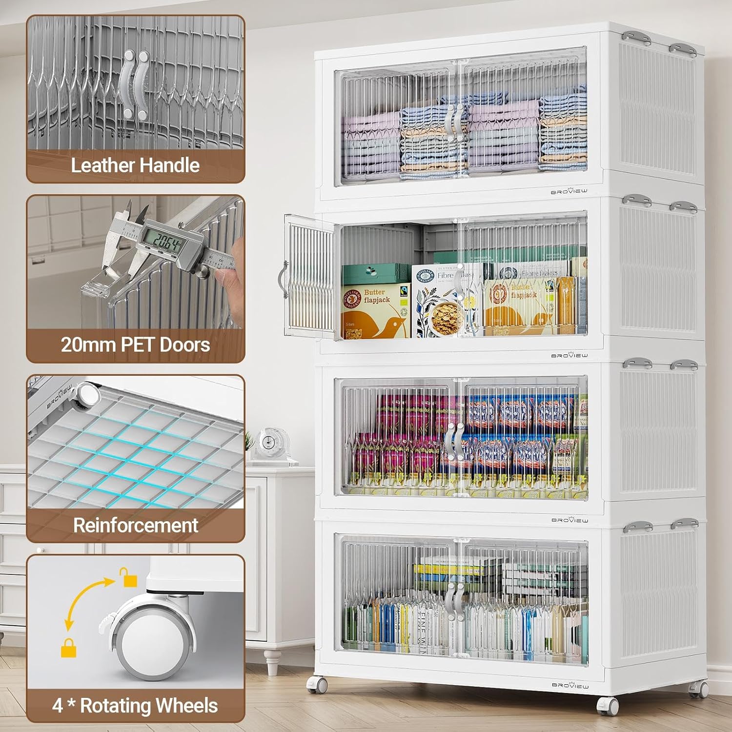 - 【Super Clear Magnetic Doors & 4x Wheeled】The large storage bins with clear PET doors provide two options: front doors opening or top lid opening. The clear PET door can be easily seen through and with a magnetic device. The 4x 360-degree rotating wheels all have fixed functions and can be easily moved by releasing the valve, making them friendly to the elderly.