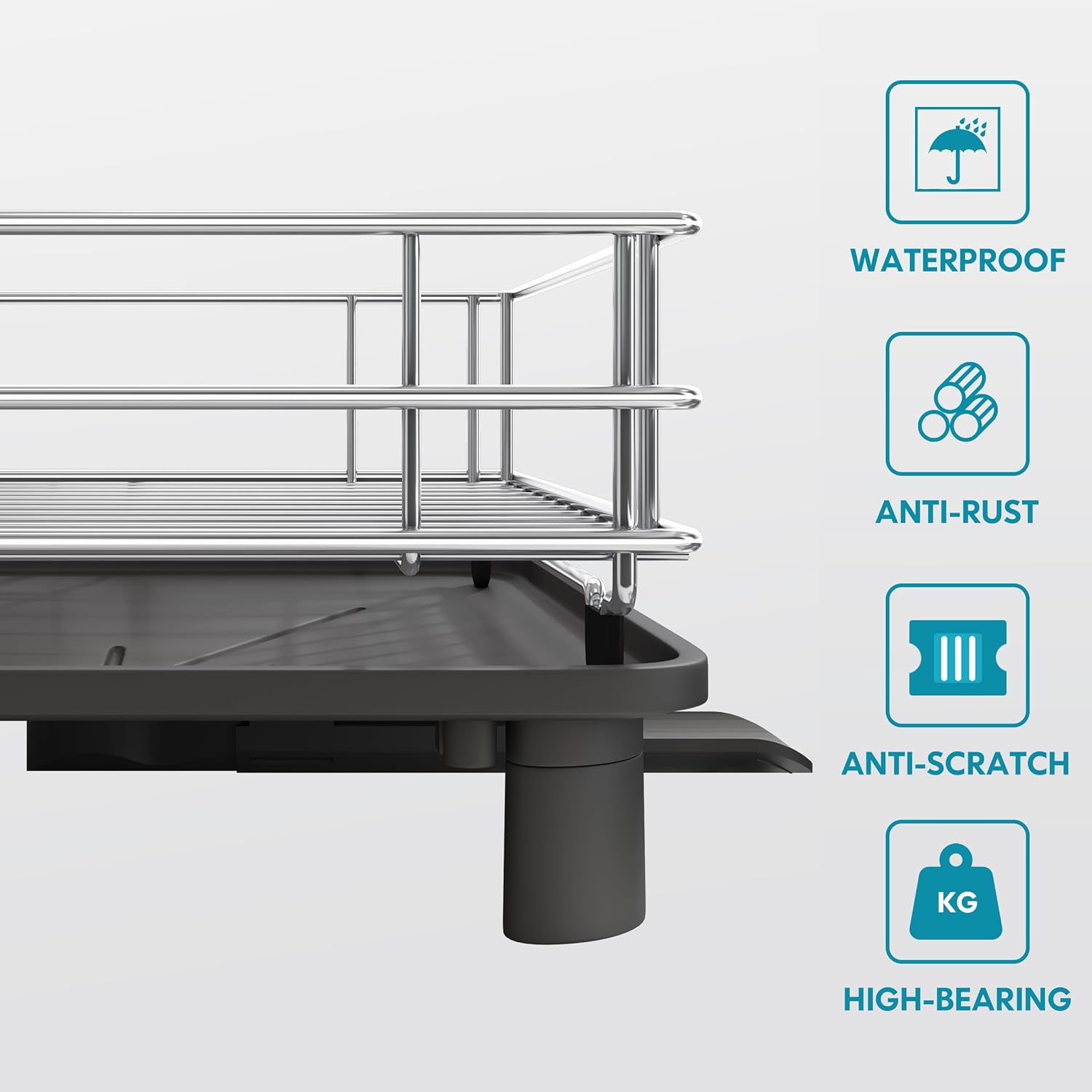- âś…Quick-Drain: Dish Rack Comes with auto drain tray set, guided channels and extended spout route water smoothly to sink, preventing water droplets leftover on the counter