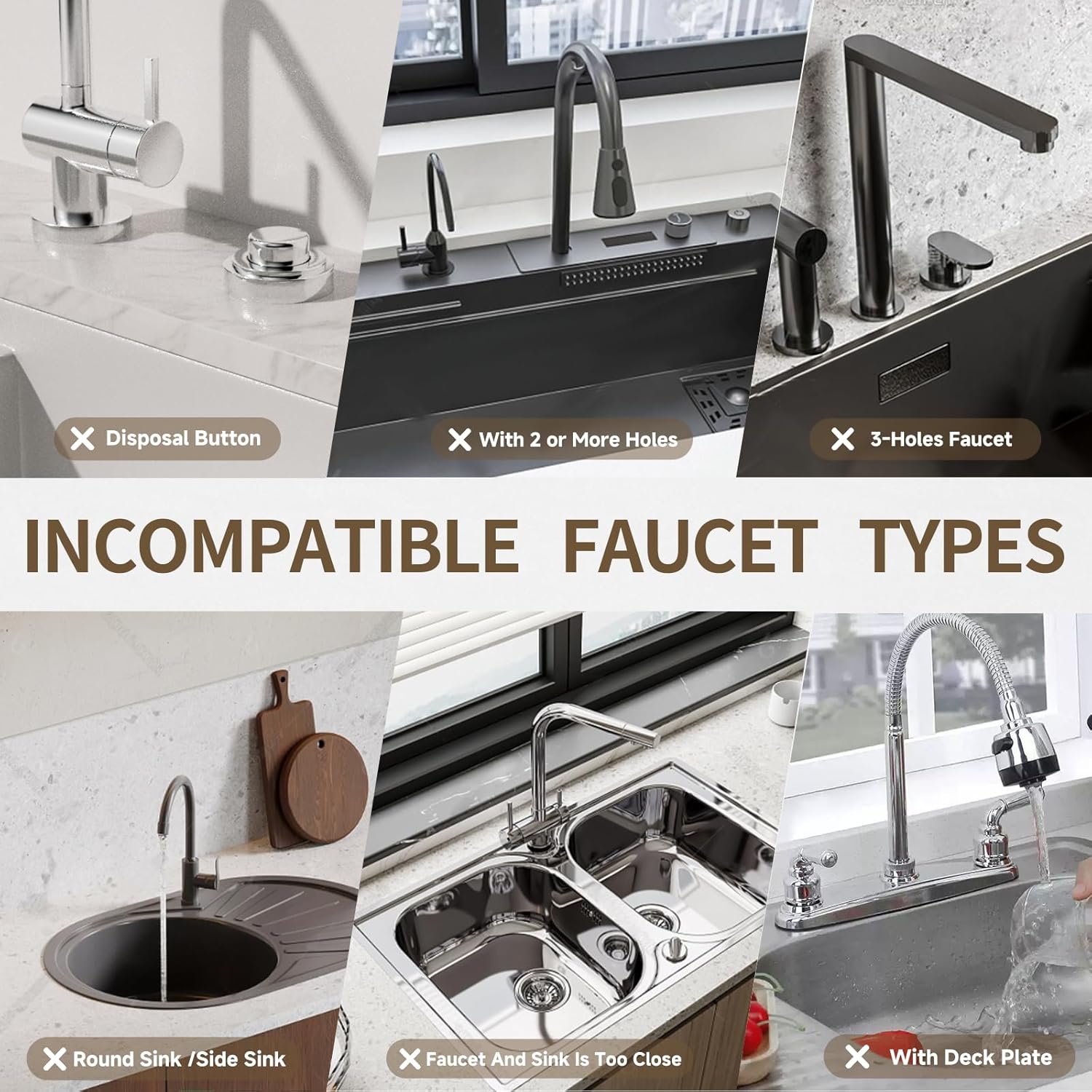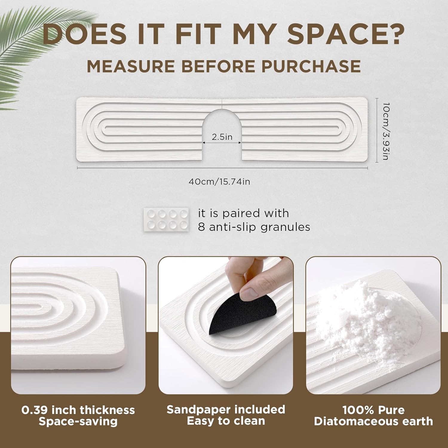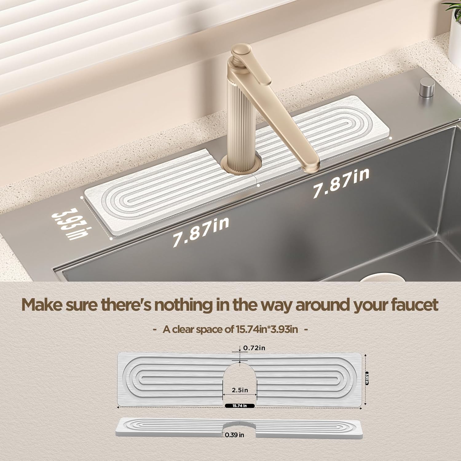 - 𝐁𝐞𝐟𝐨𝐫𝐞 𝐏𝐮𝐫𝐜𝐡𝐚𝐬𝐢𝐧𝐠: Depending on the size of the product, make sure there are no sink buttons or dispensers around the faucet and sink. Faucet base must be less than 2.5” in diameter. | Size: 23.6“ x 3.9” or 15.7“ x 3.9” with 2.5” U-holes to fit more faucets. Non-cutting hardstone sink mat