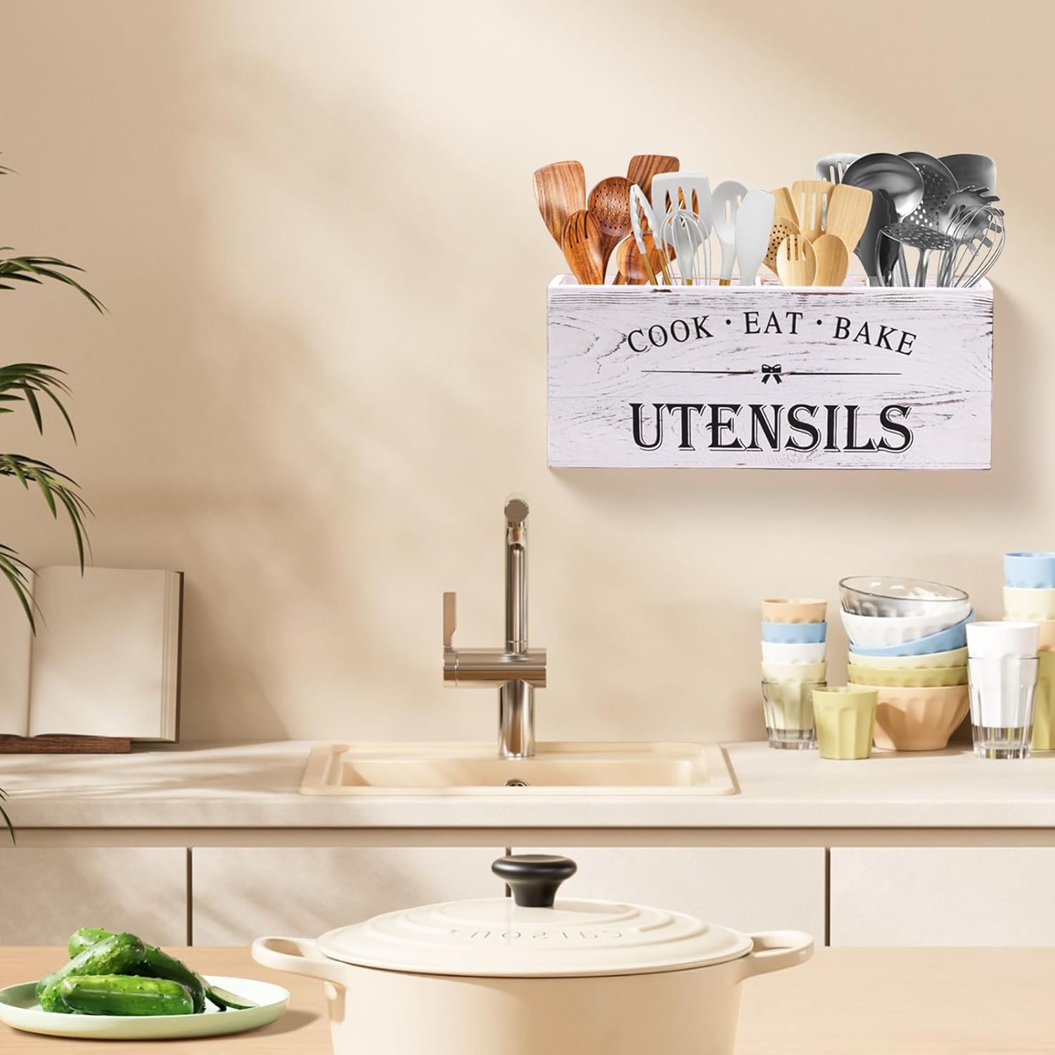 - Farmhouse Wooden Utensil Holder:Our kitchen utensil holder with 4 compartments to neatly separate spatulas, spoons, whisks, and other cooking tools—so everything stays organized and ready to use. No more digging through cluttered drawers!