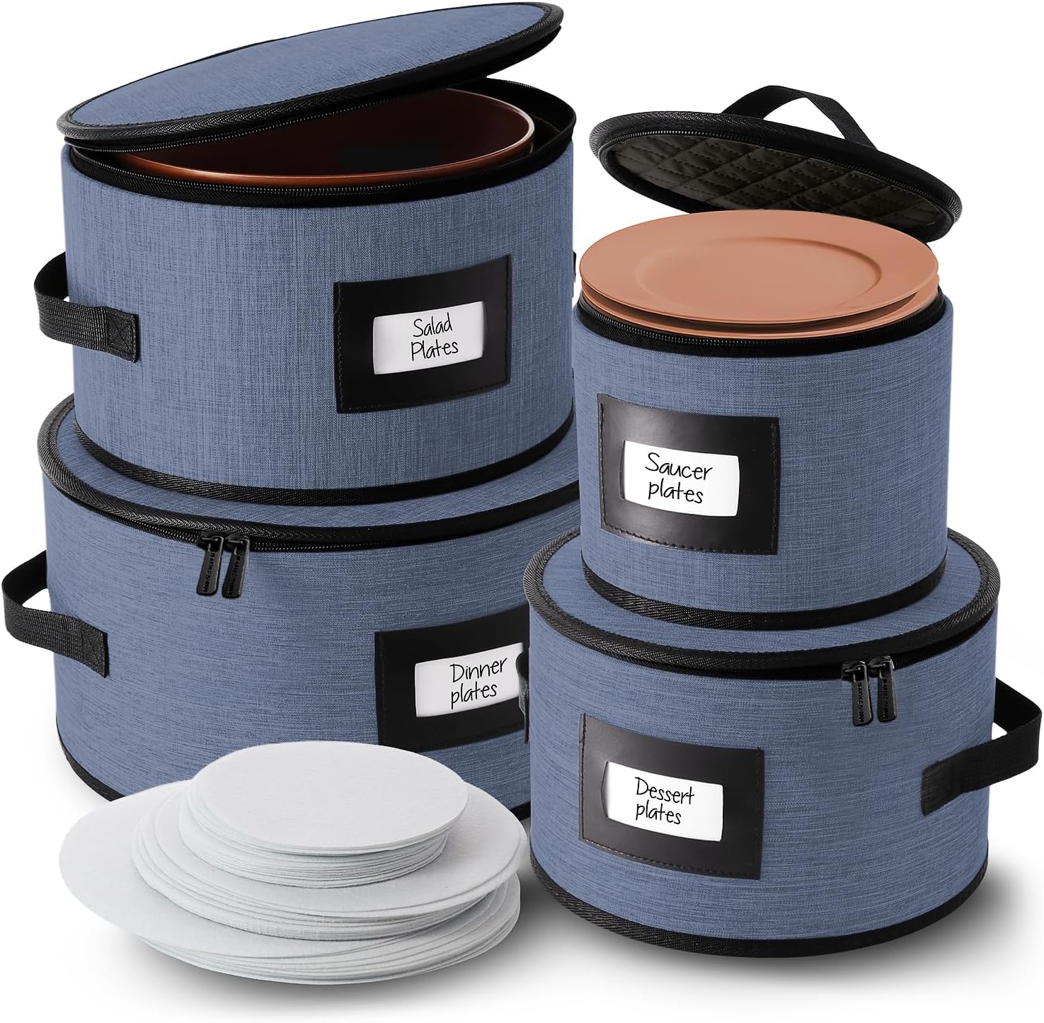 Fine China Storage Containers Hard Shell, 4 Piece Dish Storage Containers, Quilted Plate Containers, Stackable Dish Organizer with Dividers, Dinnerware Storage for Moving and Seasonal Storage, Blue