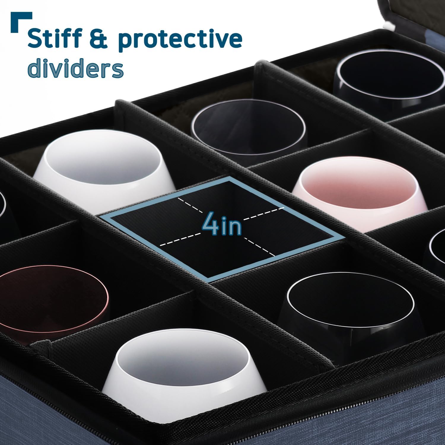 - Fits Up To 12 Cups: This wine glass storage box with dividers fits up to 12 cups in the 4-inch inner slots. Dimensions: 12.5β x 16β x 10β.