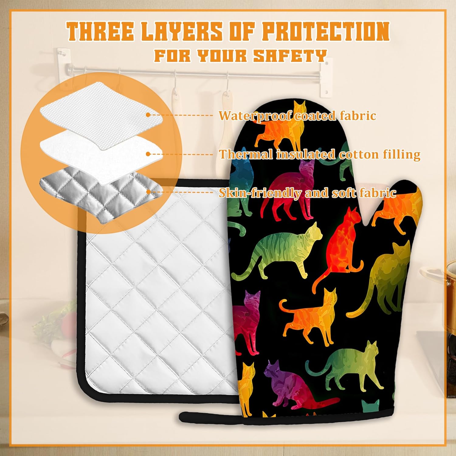 Funny Colorful Cat Oven Mitts and Pot Holders Set,Kitchen Decor Heat Resistant Non Slip Hot Pads and Oven Mitt for Chef Cooking Baking BBQ Mom Girl Gifts(4 Piece Set)