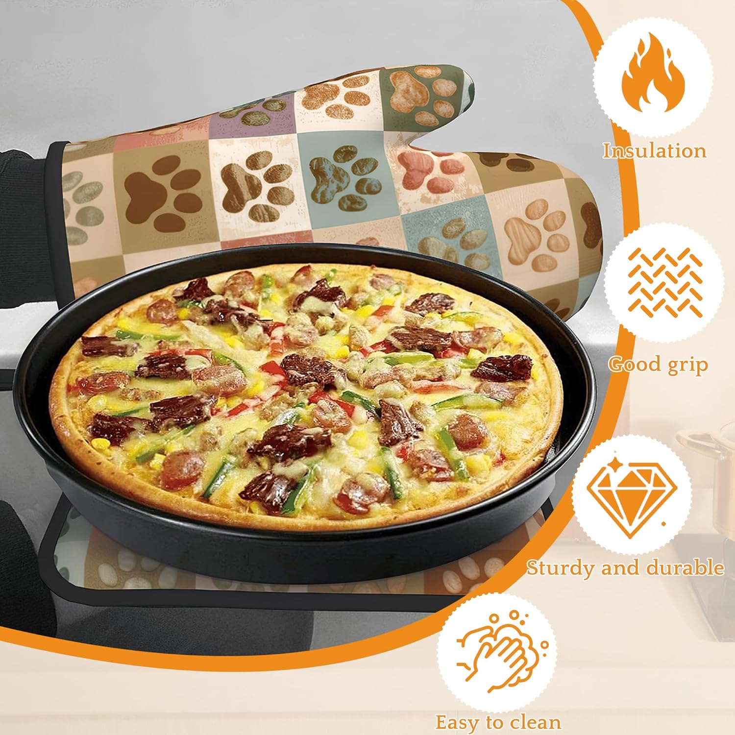 Vintage Dog Cat Paws Oven Mitts and Pot Holders Set,Kitchen Oven Gloves and Pot Holder with Heat Resistant Non Slip for Cooking Baking Grilling(4 Piece Set)