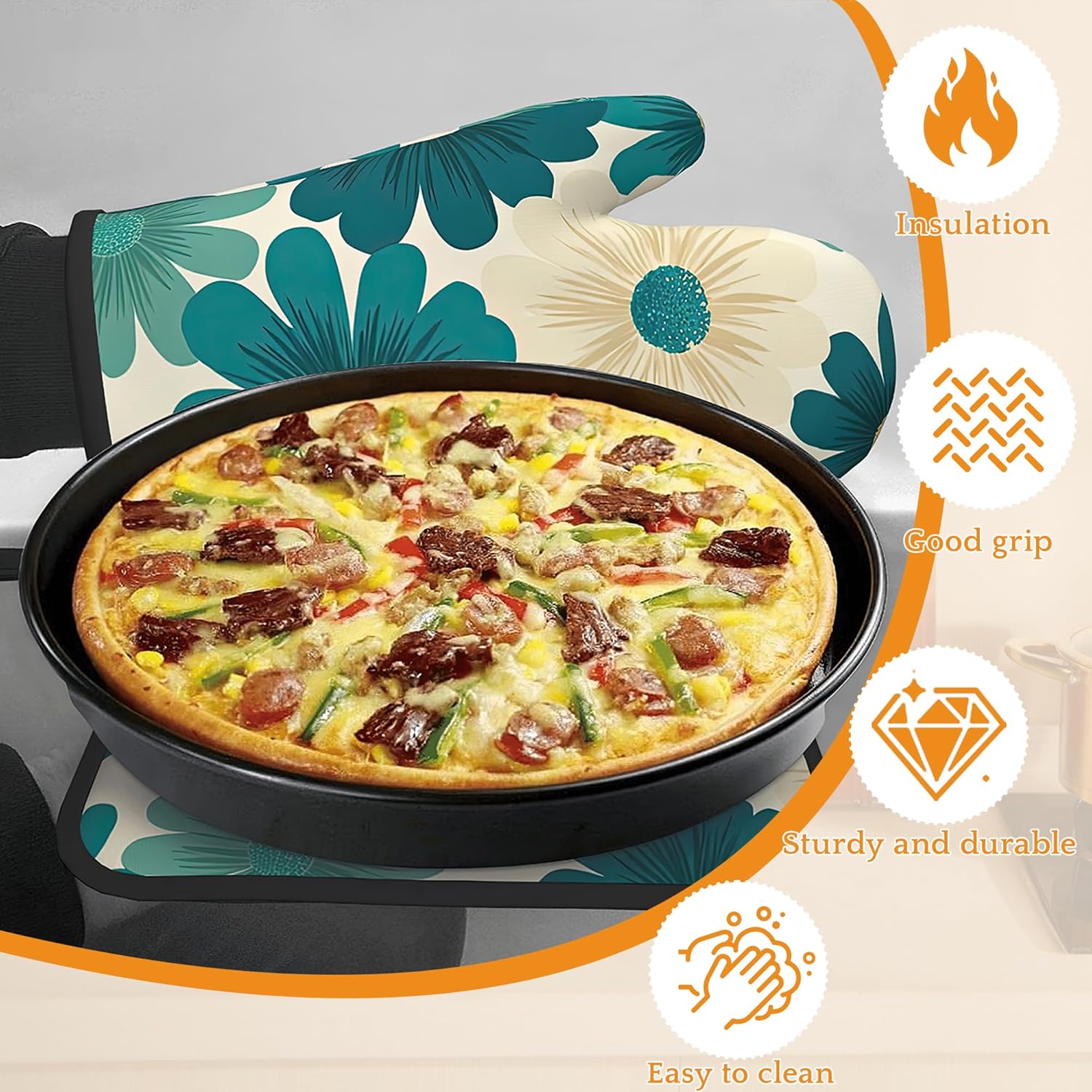 Abstract Daisy Flower Oven Mitts and Pot Holders,Retro Groovy Flowers Heat Resistant Oven Mitts Gloves and Pot Holder for Home Kitchen Decorations Cooking Baking BBQ Gifts,Set of 4