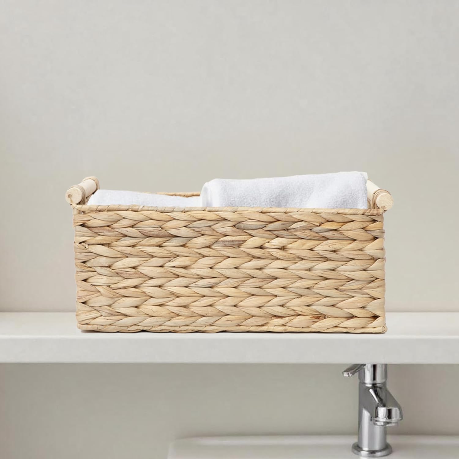 Handmade Water Hyacinth Woven Storage Baskets with Wooden Handles, Rectangle Rustic Organizer Set for Home Decor, Kitchen, Bedroom & Office (Large)