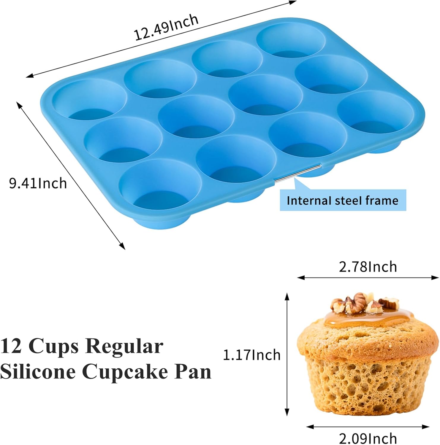Bangp 12-Cup Silicone Muffin Pan with Metal Reinforced Frame,2 Pack Regular Size Cupcake Pan,Premium Non-Stick Bend Resistance Silicone Molds for Making Muffin,Cakes,Tart,Egg Bites (Red & Blue)