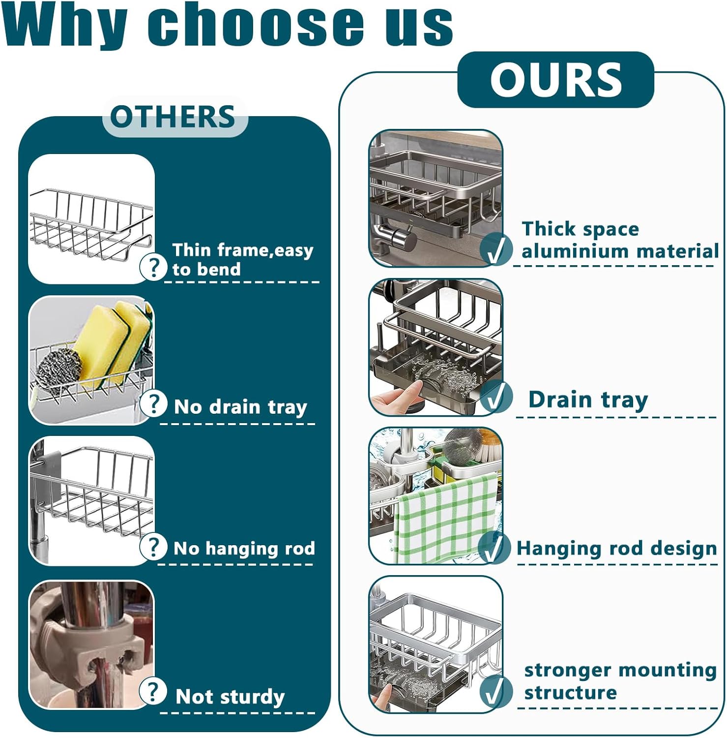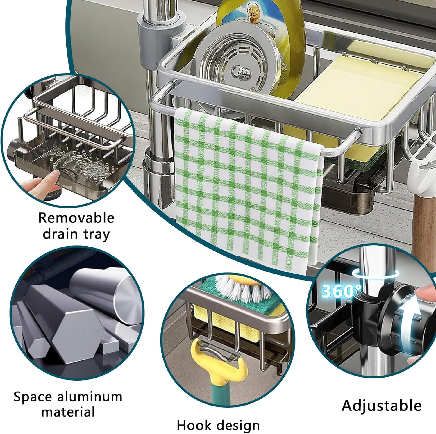 - 🛠️【Durable Rustproof Aluminum Material】Made of premium space aluminum, this sponge holder is rust-resistant, lightweight, and built to last in wet kitchen environments.