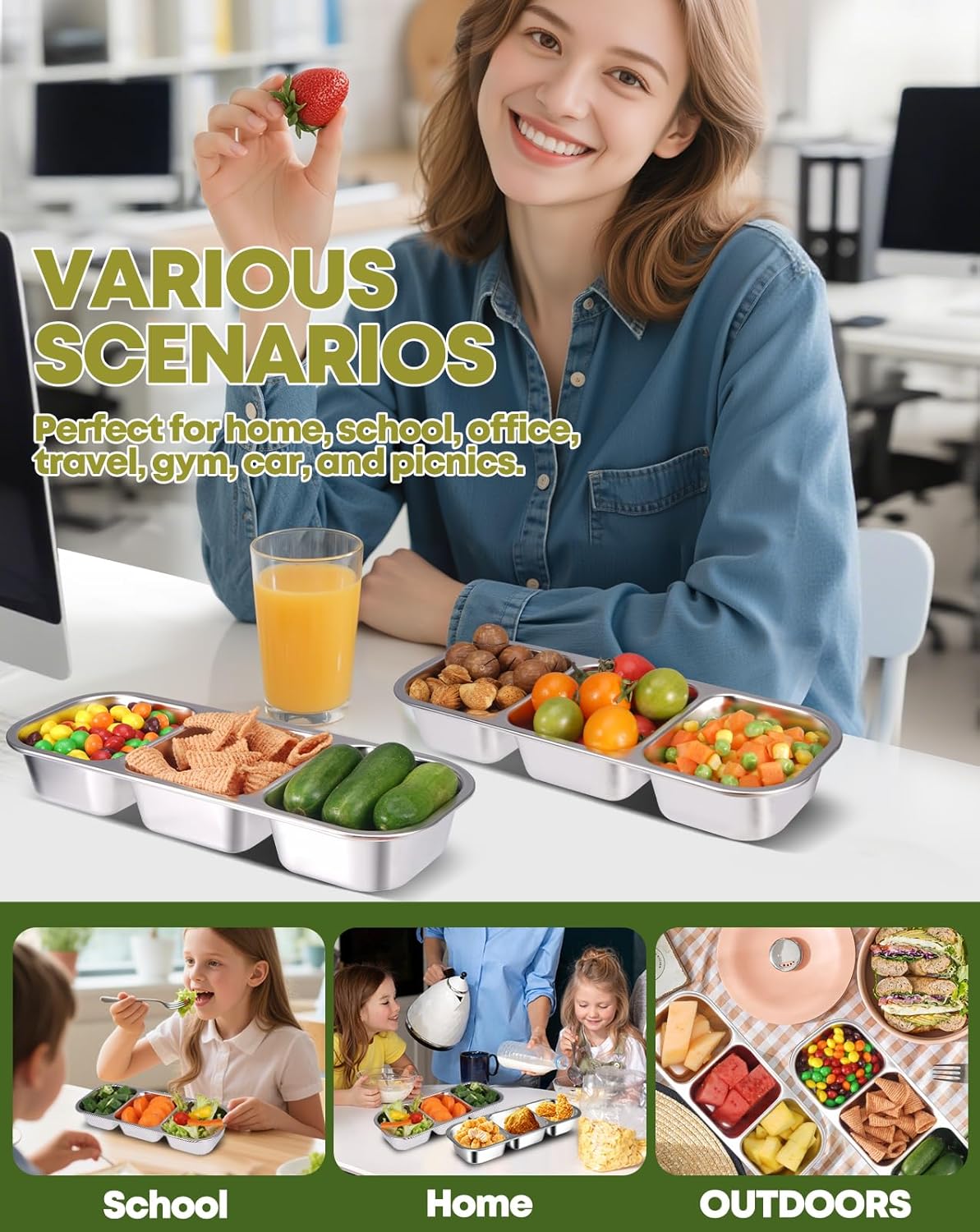 - 【Multifunctional 3-Compartment Snack Containers for Smart Separation】 Each stainless steel snack container features 3 separate compartments—perfect for keeping fruits, dips, crackers, and veggies fresh and separate. These multifunctional snack containers make it easy to pack balanced meals for school, work, or travel without mixing flavors.