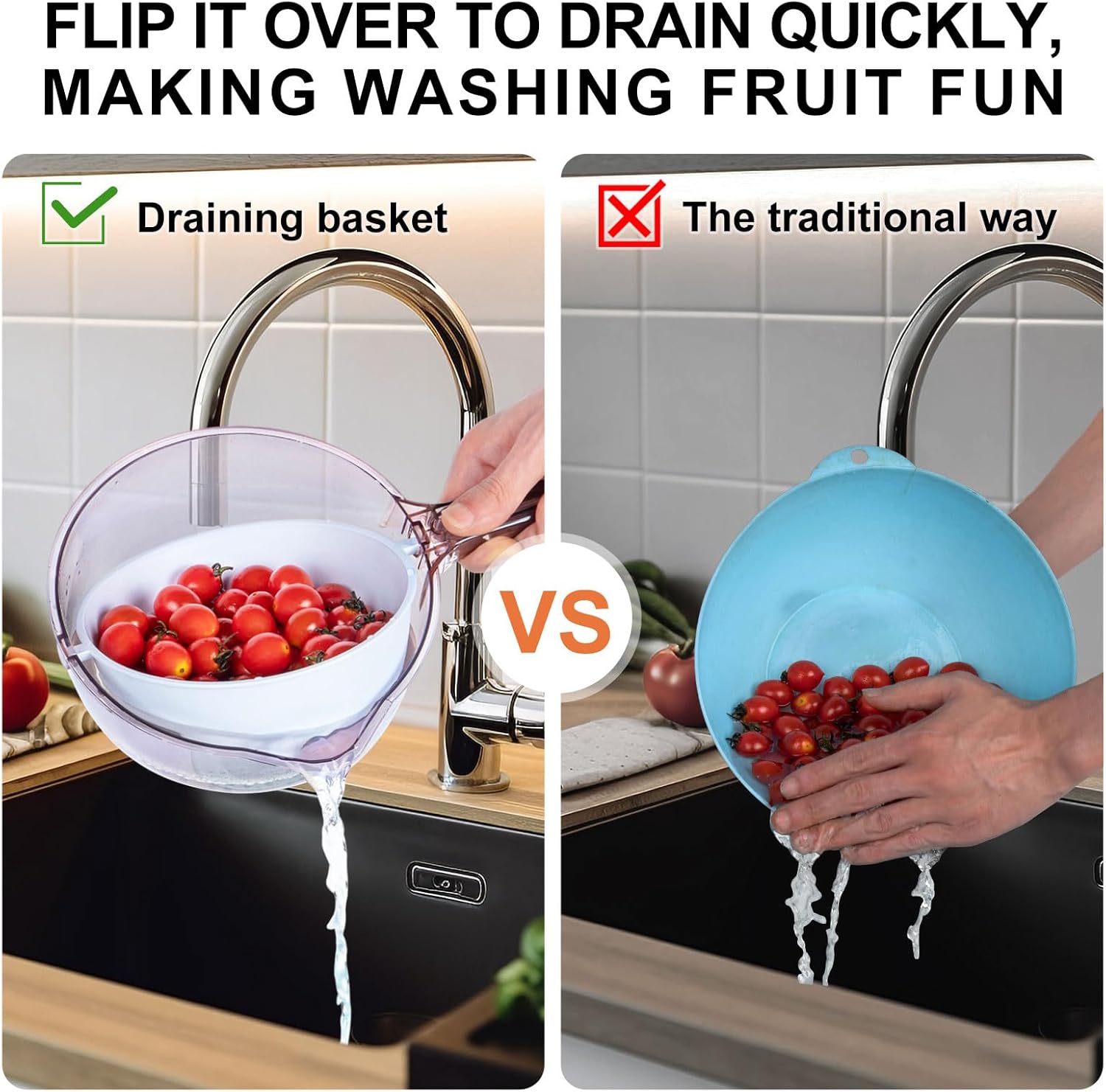 - Safe Materials: Crafted from food-safe PET + PP, this fruit cleaner bowl serves as both a rice cleaner strainer for spotless rinsing and a drain basket for quick water removal. No harmful substances, just reliable safety for daily kitchen prep.