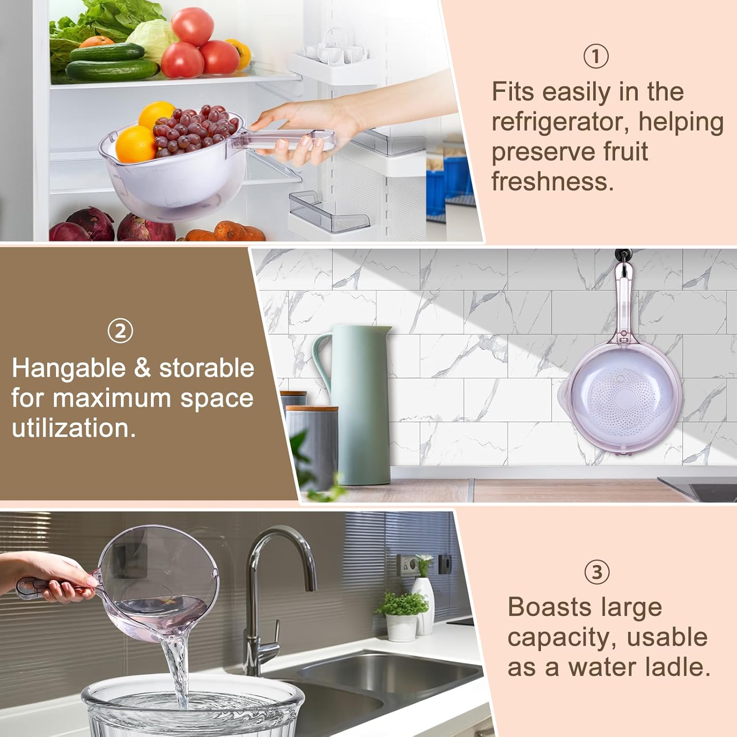- Family Must-Have Gift: This 3-in-1 kitchen tool is ideal for gifting. It can be used as a fruit strainer container with lid to drain extra water from fruits and keep them fresh, can work as a rice colander for effortless rinsing, and can serve as a water dipper with handle for easy pouring. It is a great gift for your family.