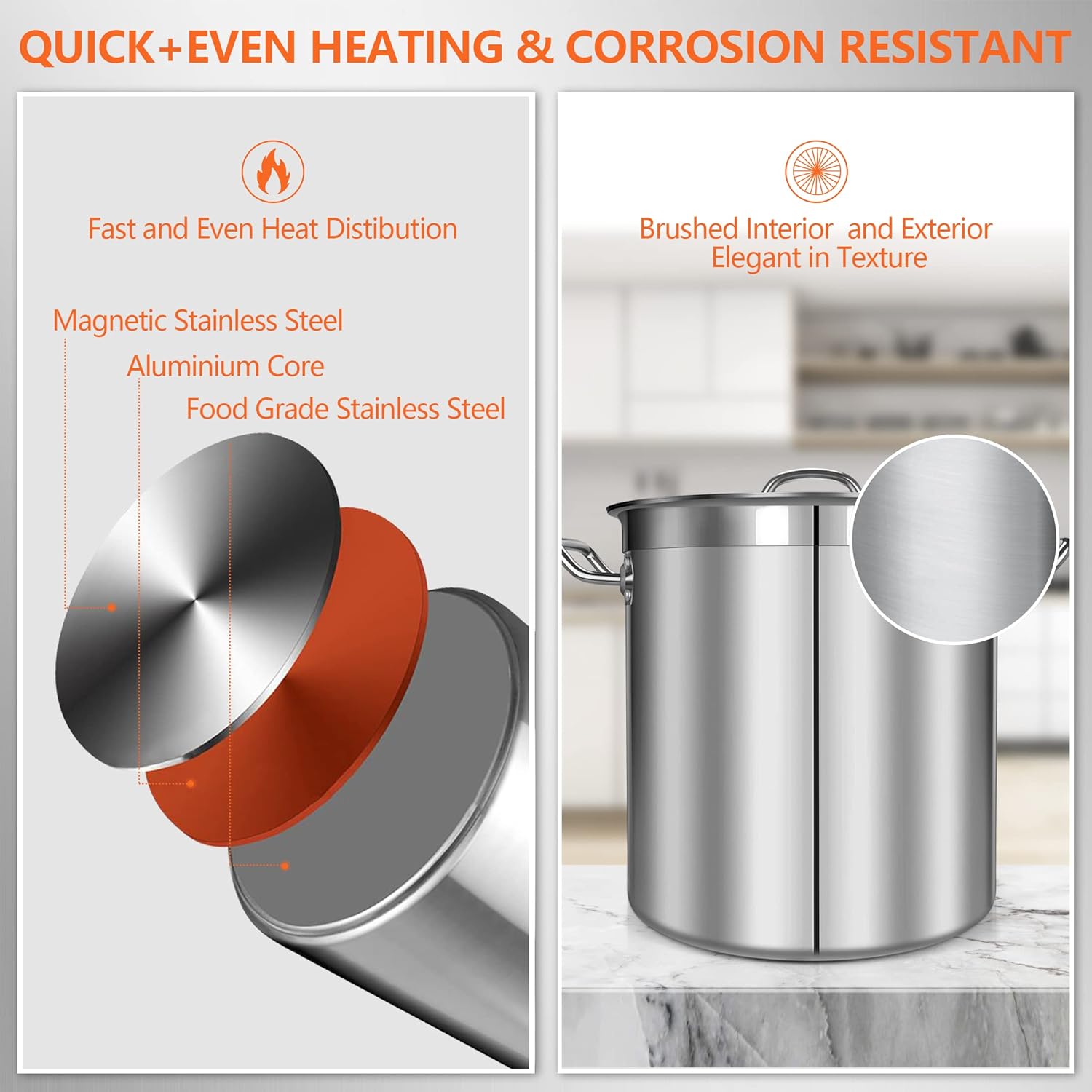 - HEAVY & STURDY & HEALTHY: The large stock pot is made of superior, non-toxic and food grade stainless steel and well designed for common use in every household. The upgraded thickness and a reinforcement ring on top of the body will prevent the cooking pot from deforming and causing air leakage when maneuvering. These cooking pots will withstand various cooking conditions and are more solid for secure move arong the kitchen.